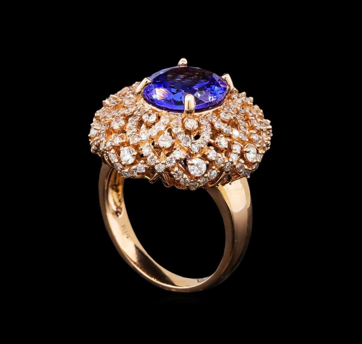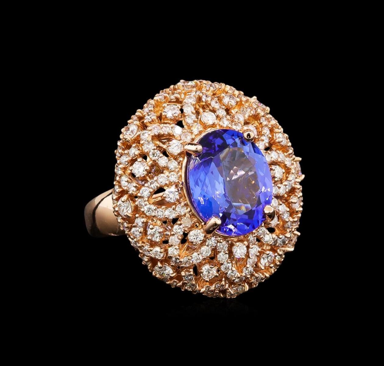 One electronically tested 14KT rose gold ladies cast tanzanite and diamond ring with a bright polish finish. Identified with markings of "14K". Condition is new. Containing: One prong set oval modified brilliant cut natural tanzanite, measuring 11.20 x 9.20 x 5.99mm, approximate weight of 4.34ct., clarity is eye clean, type I, medium, moderately strong, violet color, (GIA V 5/4), cut is good. Two Hundred Eighty prong set round brilliant cut diamonds, measuring 2.00 - 1.20 x 0.96mm (depth est.) approximate total weight of 280 Stones = 2.00 ct. Clarity: SI-2 to I-1. Color: H - I, Cut is Good. Colored gemstones are presumed to have been subjected to commonly used enhancement processes. All diamonds and colored gemstones are graded in the mounting, unless otherwise stated. Total Weight of Colored Stones 4.34ct. Total Weight of Diamonds 2.00 ct. Total Weight of Ring 9.50 grams. GGL Appraised.