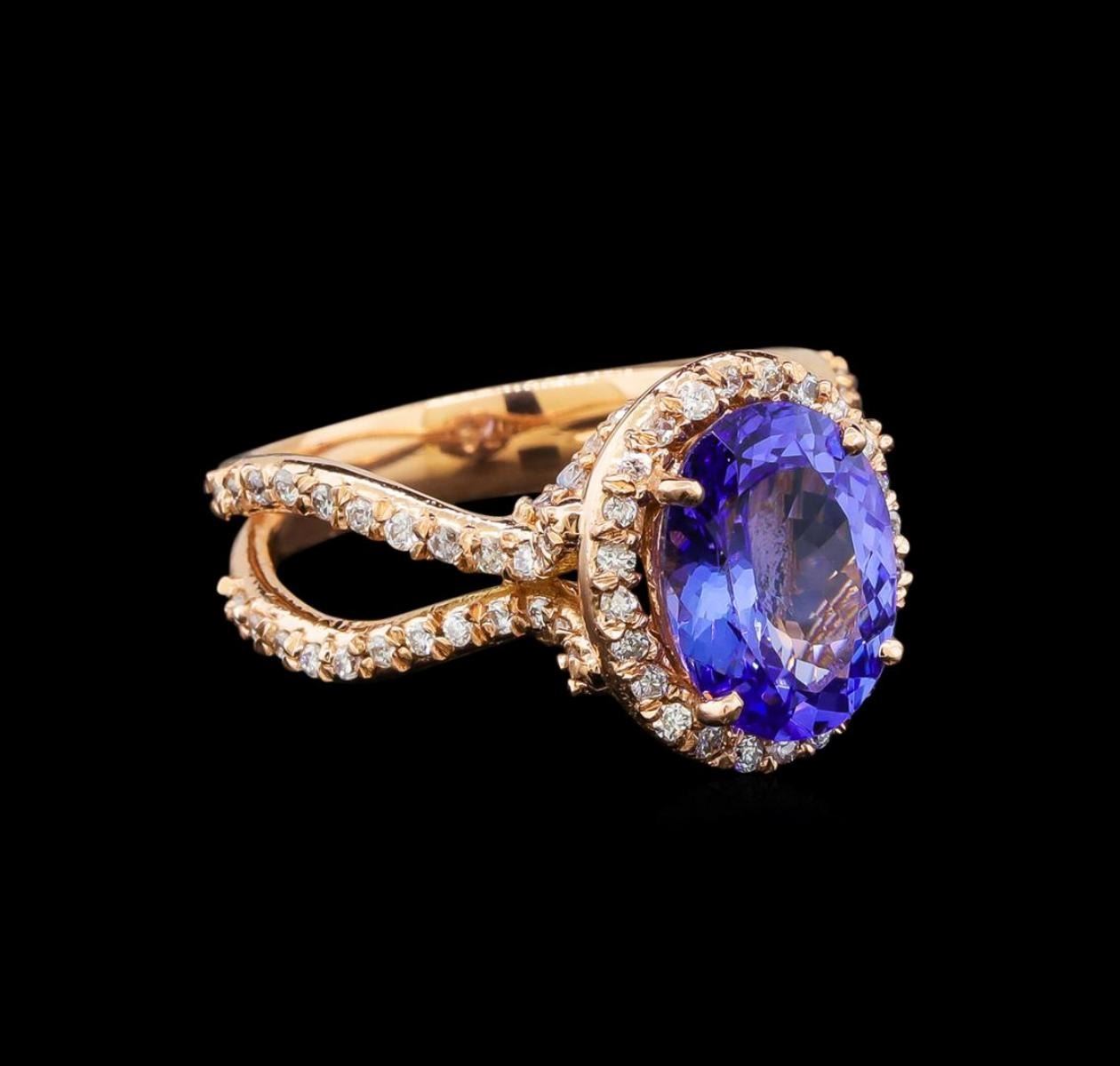 One electronically tested 14KT rose gold ladies cast tanzanite and diamond ring with a bright polish finish. Identified with markings of "14K". Condition is new. Containing: One prong set oval oval modified brilliant cut natural tanzanite, measuring 10.90 x 8.27 x 6.84mm, approximate weight of 4.34ct., clarity is eye clean, type I, medium light, very slightly grayish, violet color, (GIA V 4/3), cut is good. Ninety prong set round brilliant cut diamonds, measuring 1.20 - 1.20 x 0.72mm (depth est.) approximate total weight of 90 Stones = 0.57ct. Clarity: SI-2 to I-2. Color: J - K, Cut is Good. Colored gemstones are presumed to have been subjected to commonly used enhancement processes. All diamonds and colored gemstones are graded in the mounting, unless otherwise stated. Total Weight of Colored Stones 4.34ct. Total Weight of Diamonds 0.57ct. Total Weight of Ring 6.50 grams. GGL Appraised.