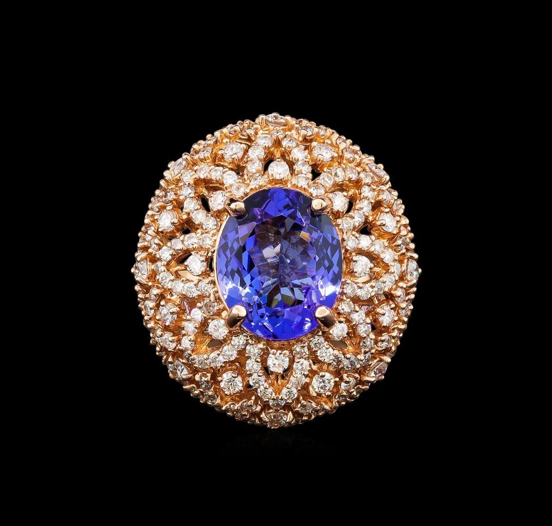 One electronically tested 14KT rose gold ladies cast tanzanite and diamond ring with a bright polish finish. Identified with markings of "14K". Condition is new. Containing: One prong set oval modified brilliant cut natural tanzanite, measuring 11.20 x 9.20 x 5.99mm, approximate weight of 4.34ct., clarity is eye clean, type I, medium, moderately strong, violet color, (GIA V 5/4), cut is good. Two Hundred Eighty prong set round brilliant cut diamonds, measuring 2.00 - 1.20 x 0.96mm (depth est.) approximate total weight of 280 Stones = 2.00 ct. Clarity: SI-2 to I-1. Color: H - I, Cut is Good. Colored gemstones are presumed to have been subjected to commonly used enhancement processes. All diamonds and colored gemstones are graded in the mounting, unless otherwise stated. Total Weight of Colored Stones 4.34ct. Total Weight of Diamonds 2.00 ct. Total Weight of Ring 9.50 grams. GGL Appraised.