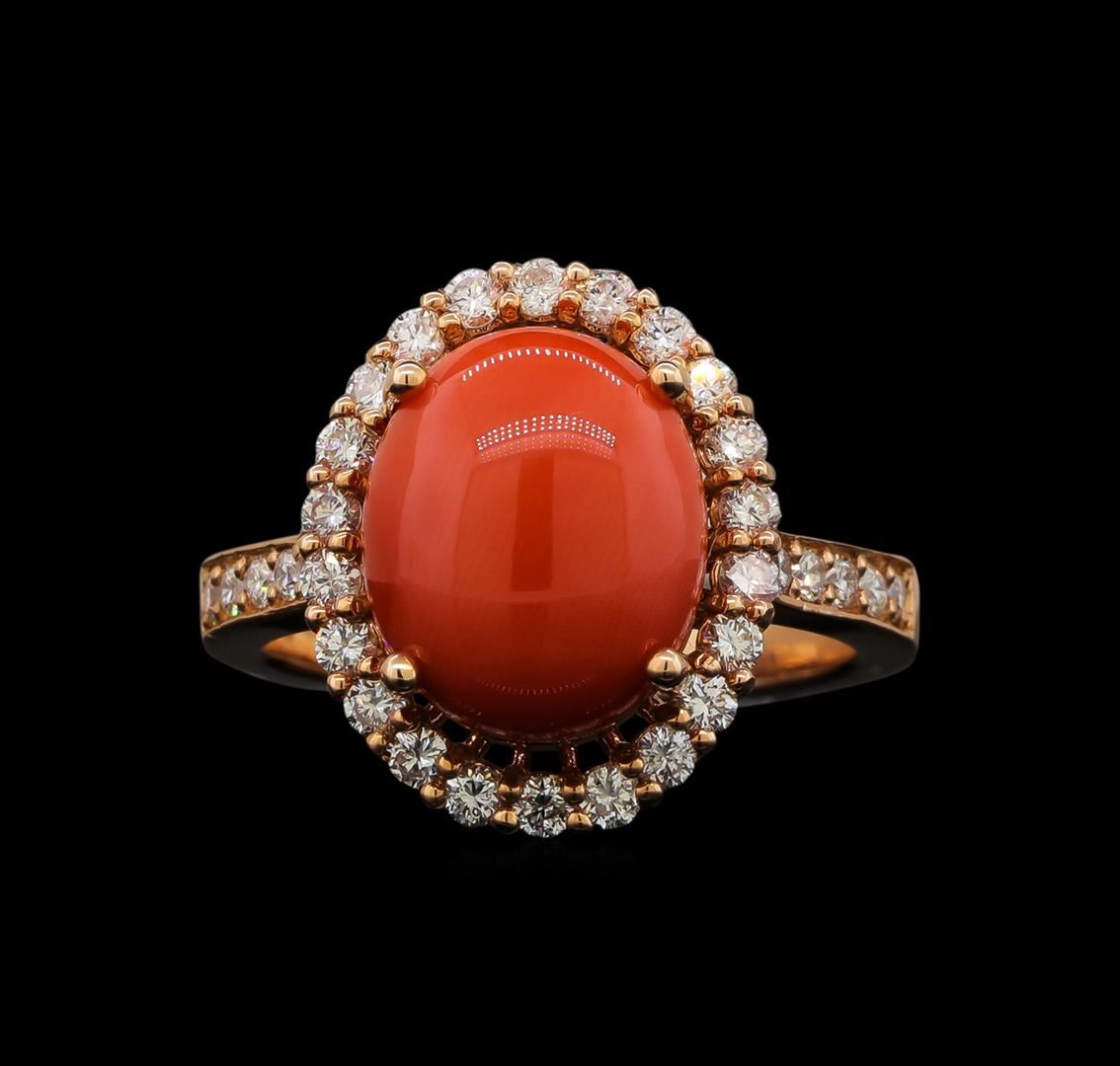 One electronically tested 14KT rose gold ladies combination cast & assembled coral and diamond ring with a flat shank with a bright polish finish. Identified with markings of "K14". Condition is new. Containing: One prong set oval cabochon cut natural red coral, measuring 11.50 x 9.70 x 6.31mm, approximate weight of 4.38ct., clarity is heavily included, medium, brownish, red color, (GIA R 5/1), cut is good. Thirty-Four prong set round brilliant cut diamonds, measuring 1.50 - 1.50 x 0.90mm (depth est.) approximate total weight of 34 Stones = 0.71ct. Clarity: SI-1 to SI-2. Color: H - I, Cut is Good. All diamonds and colored gemstones are graded in the mounting, unless otherwise stated. Colored gemstones are presumed to have been subjected to commonly used enhancement processes.. Total Weight of Colored Stones 4.38ct. Total Weight of Diamonds 0.71ct. Total Weight of Ring 6.50 grams. GGL Appraised at $3,735.00.