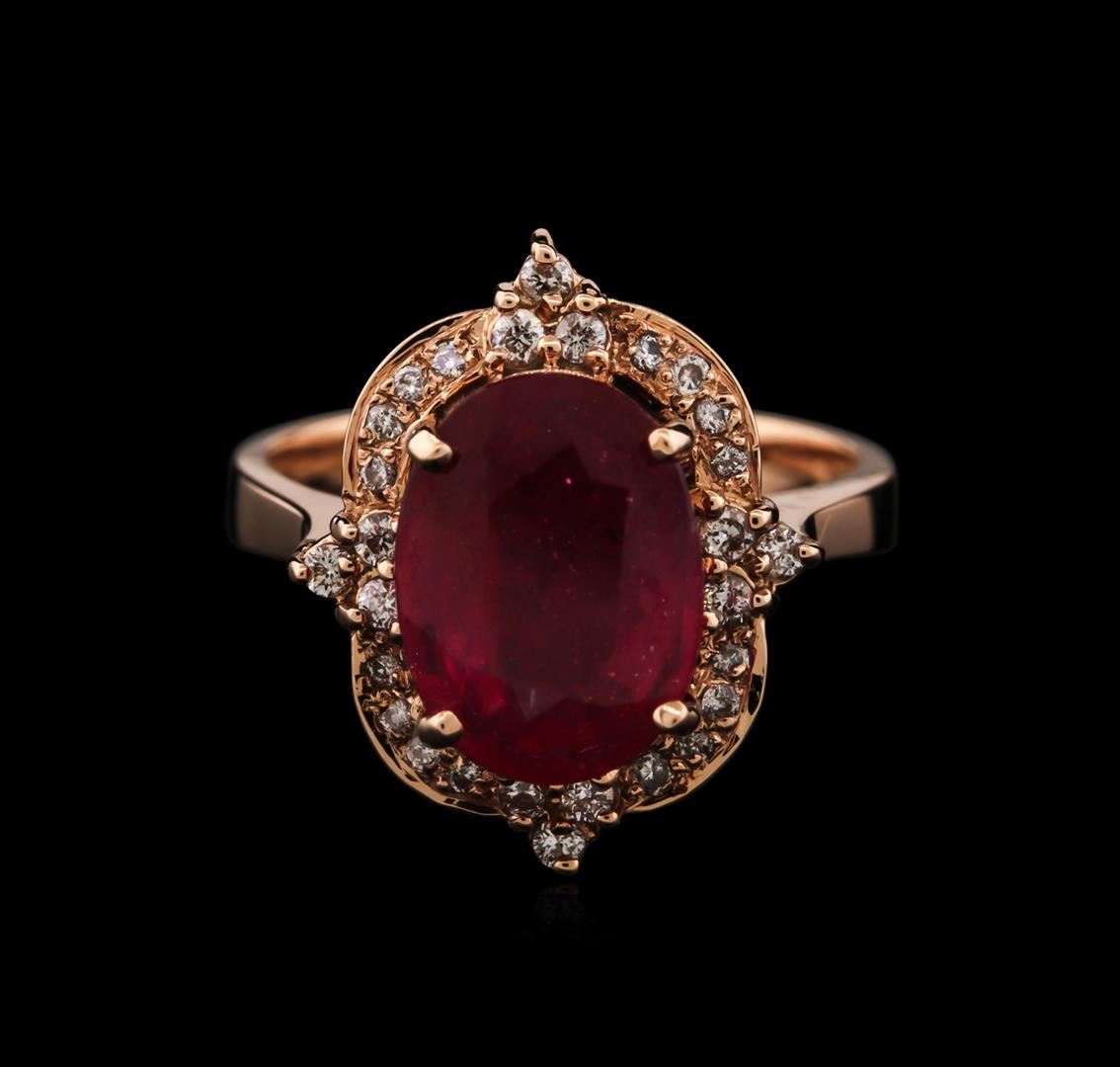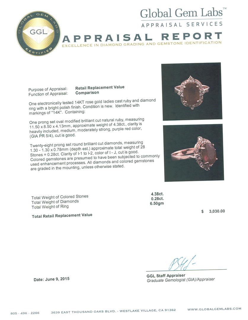 One electronically tested 14KT rose gold ladies cast ruby and diamond ring with a bright polish finish. Identified with markings of "14K". Condition is new. Containing: One prong set oval modified brilliant cut natural ruby, measuring 11.50 x 8.50 x 4.13mm, approximate weight of 4.38ct., clarity is heavily included, medium, moderately strong, purple red color, (GIA PR 5/4), cut is good. Twenty-Eight prong set round brilliant cut diamonds, measuring 1.30 - 1.30 x 0.78mm (depth est.) approximate total weight of 28 Stones = 0.28ct. Clarity: I-1 to I-2. Color: I - J, Cut is Good. Colored gemstones are presumed to have been subjected to commonly used enhancement processes. All diamonds and colored gemstones are graded in the mounting, unless otherwise stated. Total Weight of Colored Stones 4.38ct. Total Weight of Diamonds 0.28ct. Total Weight of Ring 6.50 grams. GGL Appraised at $3,030.00.