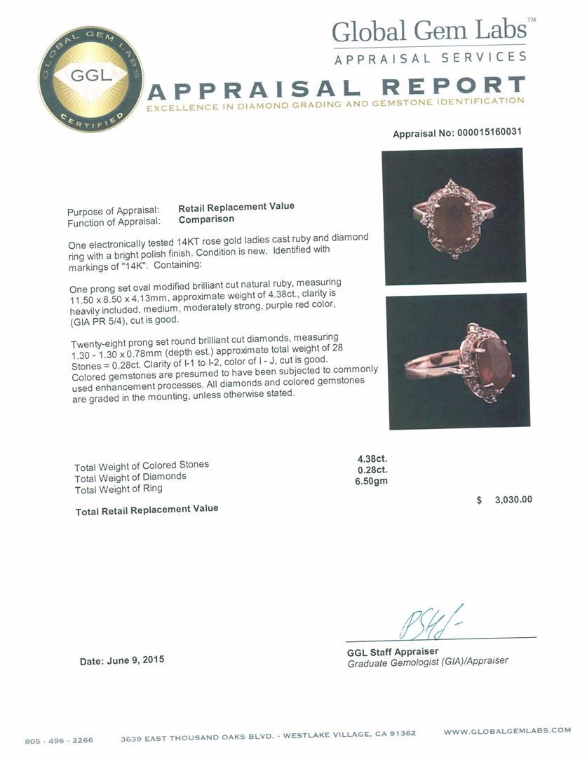 One electronically tested 14KT rose gold ladies cast ruby and diamond ring with a bright polish finish. Identified with markings of "14K". Condition is new. Containing: One prong set oval modified brilliant cut natural ruby, measuring 11.50 x 8.50 x 4.13mm, approximate weight of 4.38ct., clarity is heavily included, medium, moderately strong, purple red color, (GIA PR 5/4), cut is good. Twenty-Eight prong set round brilliant cut diamonds, measuring 1.30 - 1.30 x 0.78mm (depth est.) approximate total weight of 28 Stones = 0.28ct. Clarity: I-1 to I-2. Color: I - J, Cut is Good. Colored gemstones are presumed to have been subjected to commonly used enhancement processes. All diamonds and colored gemstones are graded in the mounting, unless otherwise stated. Total Weight of Colored Stones 4.38ct. Total Weight of Diamonds 0.28ct. Total Weight of Ring 6.50 grams. GGL Appraised at $3,030.00.