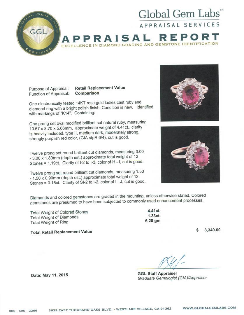 One electronically tested 14KT rose gold ladies cast ruby and diamond ring with a bright polish finish. Identified with markings of "K14". Condition is new. Containing: One prong set oval modified brilliant cut natural ruby, measuring 10.67 x 8.70 x 5.66mm, approximate weight of 4.41ct., clarity is heavily included, type II, medium dark, moderately strong, strongly purplish red color, (GIA stpR 6/4), cut is good. Twelve prong set round brilliant cut diamonds, measuring 3.00 - 3.00 x 1.80mm (depth est.) approximate total weight of 12 Stones = 1.19ct. Clarity: I-2 to I-3. Color: H - I, Cut is Good. Twelve prong set round brilliant cut diamonds, measuring 1.50 - 1.50 x 0.90mm (depth est.) approximate total weight of 12 Stones = 0.15ct. Clarity: SI-2 to I-2. Color: I - J, Cut is Good. Diamonds and colored gemstones are graded in the mounting, unless otherwise stated. Colored gemstones are presumed to have been subjected to commonly used enhancement processes. Total Weight of Colored Stones 4.41ct. Total Weight of Diamonds 1.33ct. Total Weight of Ring 6.20 grams. GGL Appraised at $3,340.00.