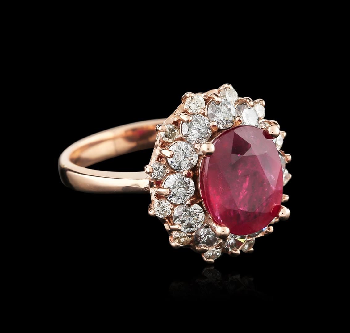 One electronically tested 14KT rose gold ladies cast ruby and diamond ring with a bright polish finish. Identified with markings of "K14". Condition is new. Containing: One prong set oval modified brilliant cut natural ruby, measuring 10.67 x 8.70 x 5.66mm, approximate weight of 4.41ct., clarity is heavily included, type II, medium dark, moderately strong, strongly purplish red color, (GIA stpR 6/4), cut is good. Twelve prong set round brilliant cut diamonds, measuring 3.00 - 3.00 x 1.80mm (depth est.) approximate total weight of 12 Stones = 1.19ct. Clarity: I-2 to I-3. Color: H - I, Cut is Good. Twelve prong set round brilliant cut diamonds, measuring 1.50 - 1.50 x 0.90mm (depth est.) approximate total weight of 12 Stones = 0.15ct. Clarity: SI-2 to I-2. Color: I - J, Cut is Good. Diamonds and colored gemstones are graded in the mounting, unless otherwise stated. Colored gemstones are presumed to have been subjected to commonly used enhancement processes. Total Weight of Colored Stones 4.41ct. Total Weight of Diamonds 1.33ct. Total Weight of Ring 6.20 grams. GGL Appraised at $3,340.00.