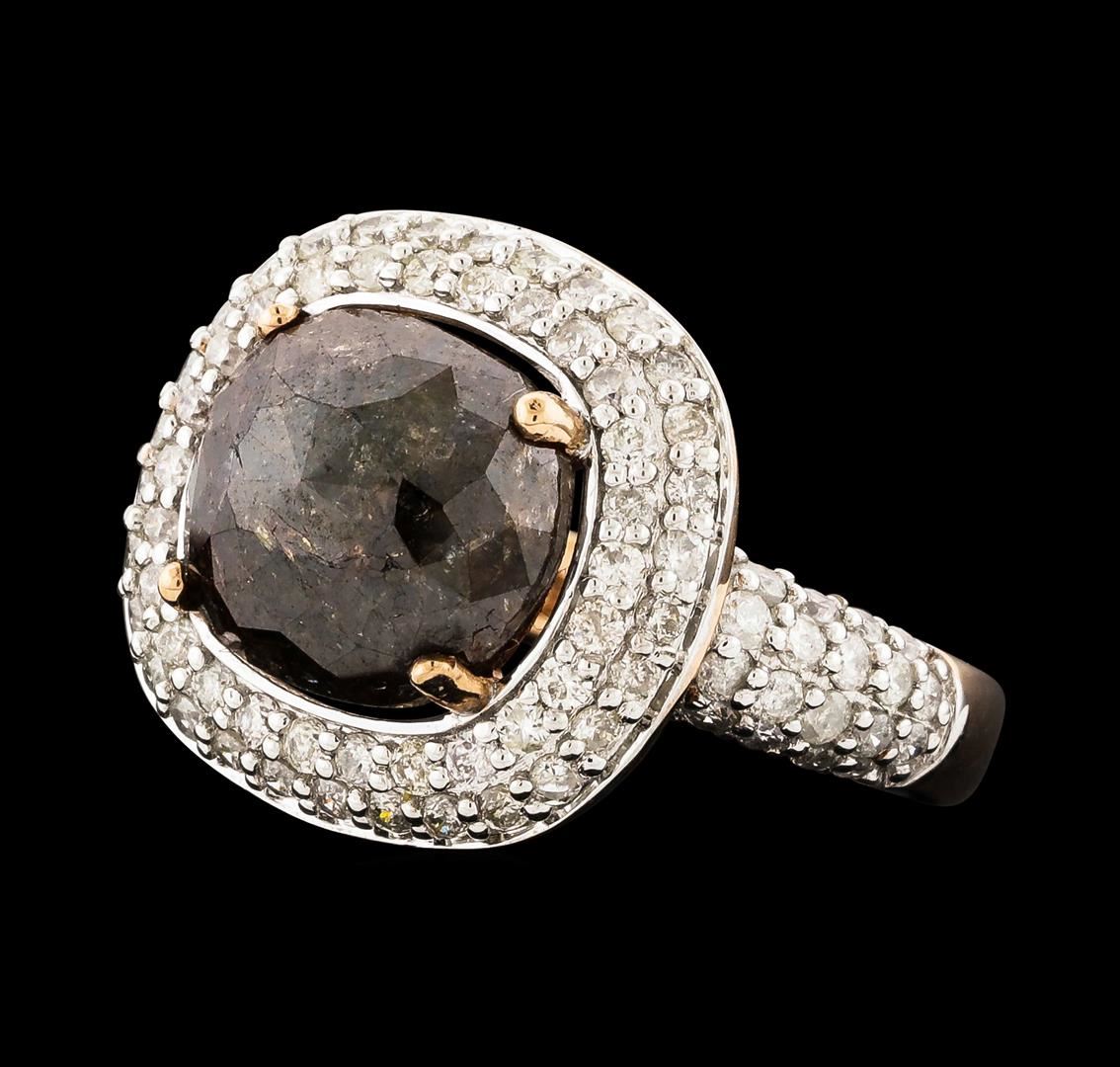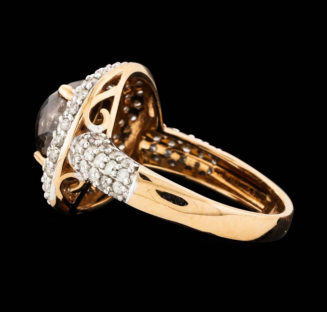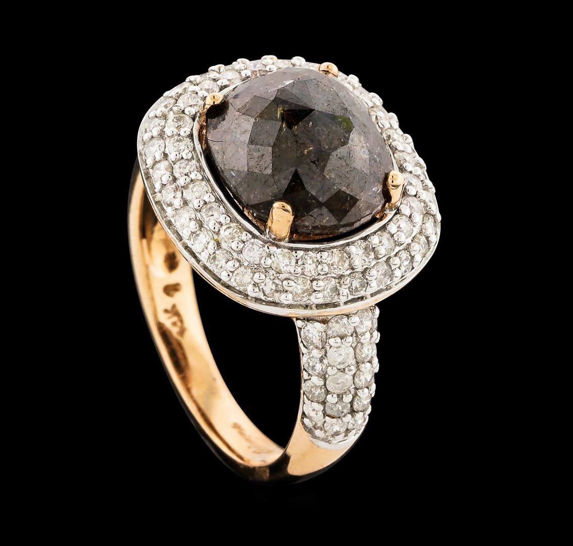 One electronically tested 14KT rose gold ladies cast brown and white diamond ring with a bright polish finish. The featured brown diamond is set within a white diamond lattice galley, supported by diamond set shoulders and completed by a two and one-half millimeter wide band. Bright polish finish with rhodium accents. Trademark is Orianne. Identified with markings of "14K". Condition is new, good workmanship. Containing: One prong set cushion cut diamond, measuring 10.10 x 9.25 x 3.80mm (depth est.) approximate weight of 3.43ct. Indications of multiple laboratory enhancements. Diamond tester results are non reactive. Graded in the setting. Clarity D‚class‚. Color: Fancy Brown; Irradiated. Ninety-Two prong set round brilliant cut diamonds, measuring 1.50 - 1.40 x 0.87mm (depth est.) approximate total weight of 92 Stones = 1.05ct. Graded in the setting. Clarity: I-1 to I-3. Color: G - I. Total Weight of Diamonds 4.48ct. Total Weight of Ring 5.10gm. AIG Appraised at $6,300.00.
