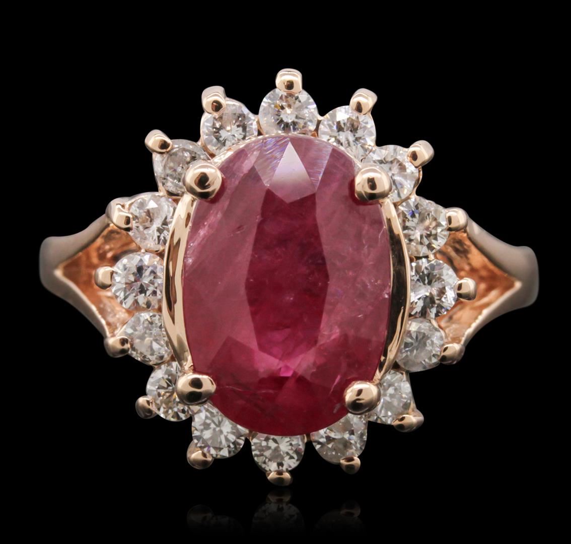 One ring featuring: 14KT Rose Gold with a total weight of 6.70 grams, Ruby with a total weight of 4.59ct, and Diamonds with a total weight of 0.64ctw.