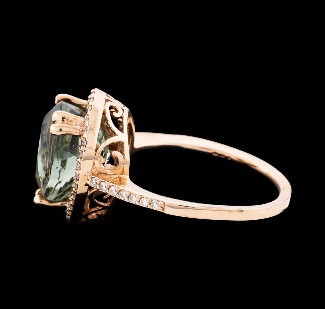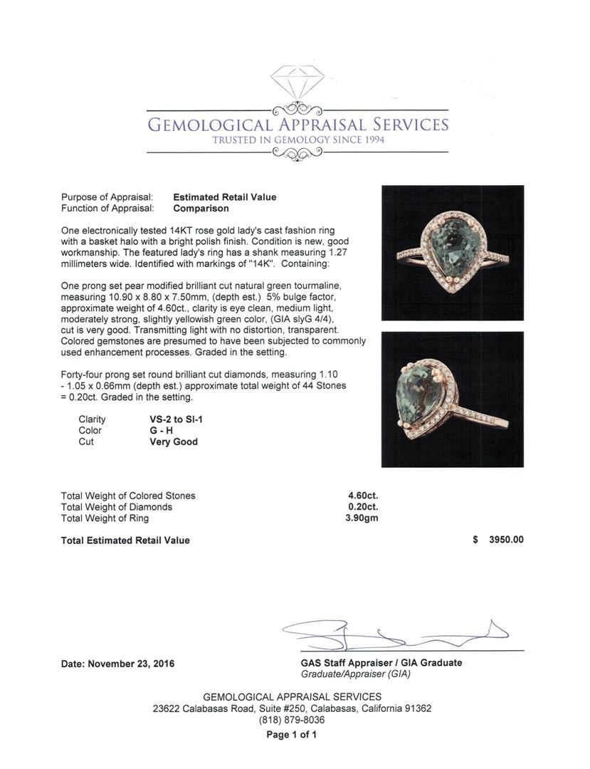 One electronically tested 14KT rose gold lady's cast fashion ring with a basket halo with a bright polish finish. The featured lady's ring has a shank measuring 1.27 millimeters wide. Identified with markings of "14K". Condition is new, good workmanship. Containing: One prong set pear modified brilliant cut natural green tourmaline, measuring 10.90 x 8.80 x 7.50mm, (depth est.) 5%. bulge factor, approximate weight of 4.60ct., clarity is eye clean, medium light, moderately strong, slightly yellowish green color, (GIA slyG 4/4), cut is very good. Transmitting light with no distortion, transparent. Colored gemstones are presumed to have been subjected to commonly used enhancement processes. Graded in the setting. Forty-Four prong set round brilliant cut diamonds, measuring 1.10 - 1.05 x 0.66mm (depth est.) approximate total weight of 44 Stones = 0.20ct. Graded in the setting. Clarity: VS-2 to SI-1. Color: G - HCut Very Good. Total Weight of Colored Stones 4.60ct. Total Weight of Diamonds 0.20ct. Total Weight of Ring 3.90gm. GAS Appraised at $3,950.00.