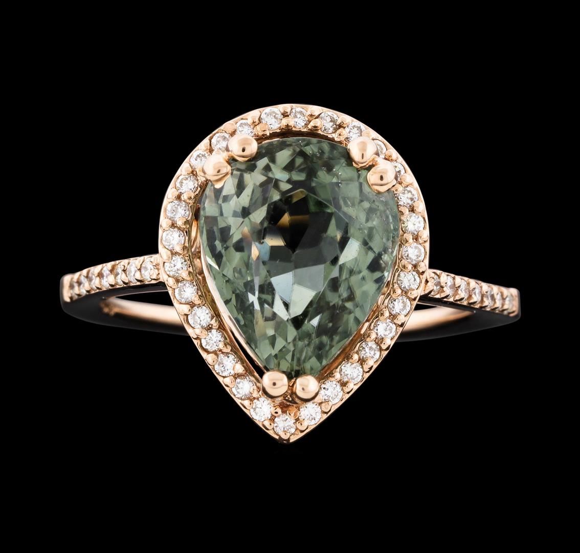 One electronically tested 14KT rose gold lady's cast fashion ring with a basket halo with a bright polish finish. The featured lady's ring has a shank measuring 1.27 millimeters wide. Identified with markings of "14K". Condition is new, good workmanship. Containing: One prong set pear modified brilliant cut natural green tourmaline, measuring 10.90 x 8.80 x 7.50mm, (depth est.) 5%. bulge factor, approximate weight of 4.60ct., clarity is eye clean, medium light, moderately strong, slightly yellowish green color, (GIA slyG 4/4), cut is very good. Transmitting light with no distortion, transparent. Colored gemstones are presumed to have been subjected to commonly used enhancement processes. Graded in the setting. Forty-Four prong set round brilliant cut diamonds, measuring 1.10 - 1.05 x 0.66mm (depth est.) approximate total weight of 44 Stones = 0.20ct. Graded in the setting. Clarity: VS-2 to SI-1. Color: G - HCut Very Good. Total Weight of Colored Stones 4.60ct. Total Weight of Diamonds 0.20ct. Total Weight of Ring 3.90gm. GAS Appraised.