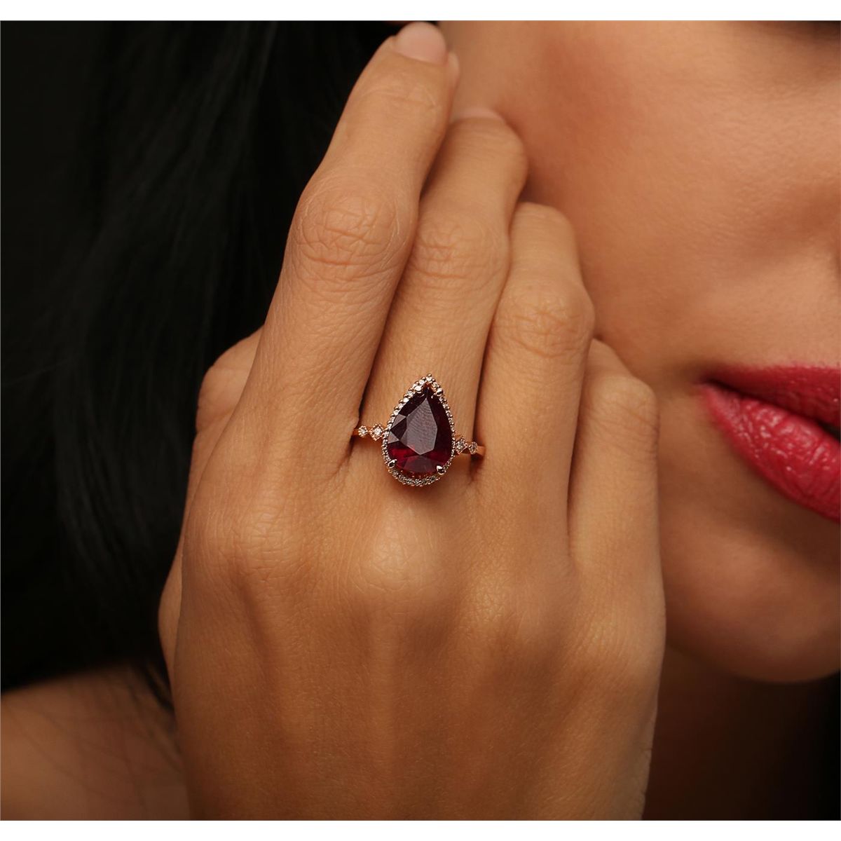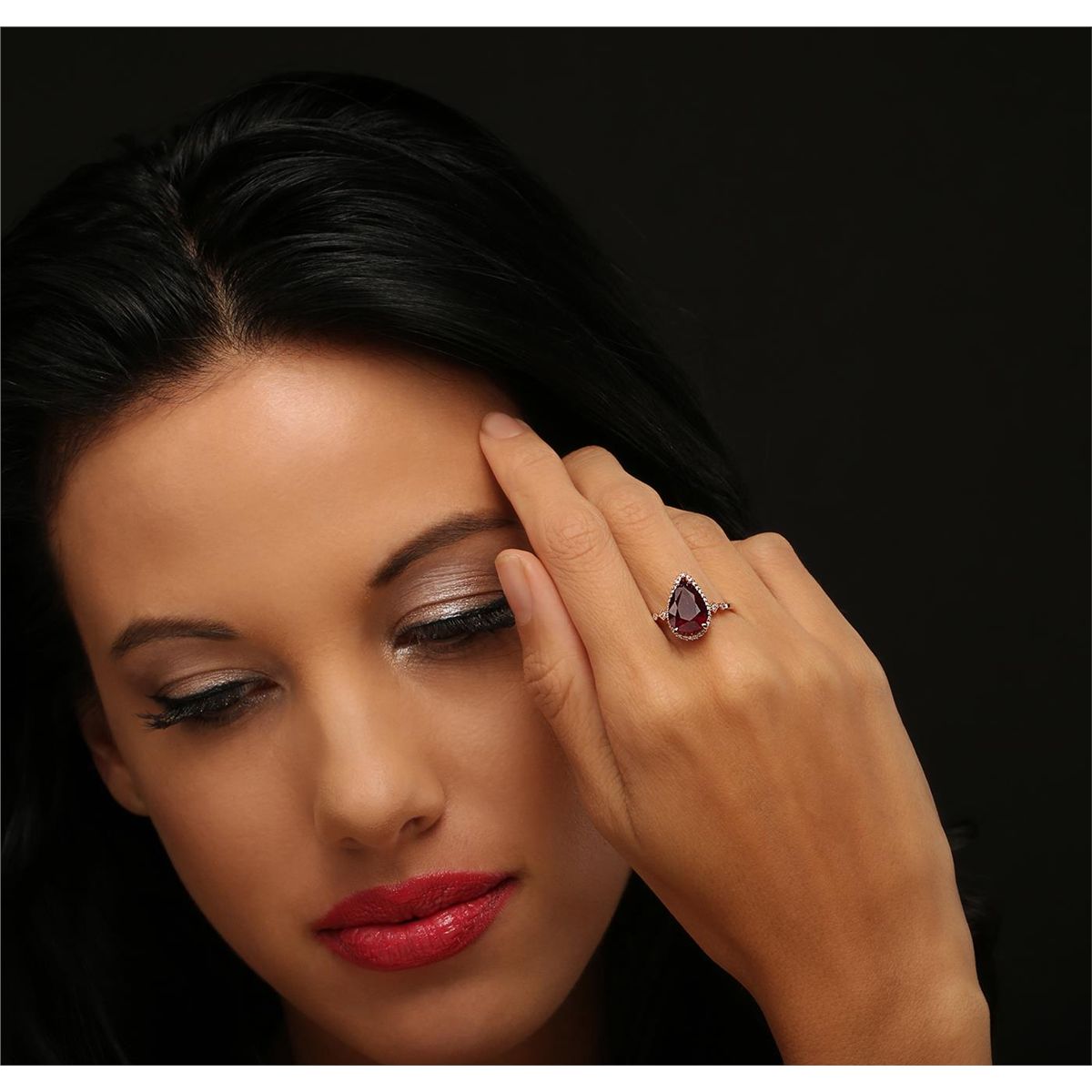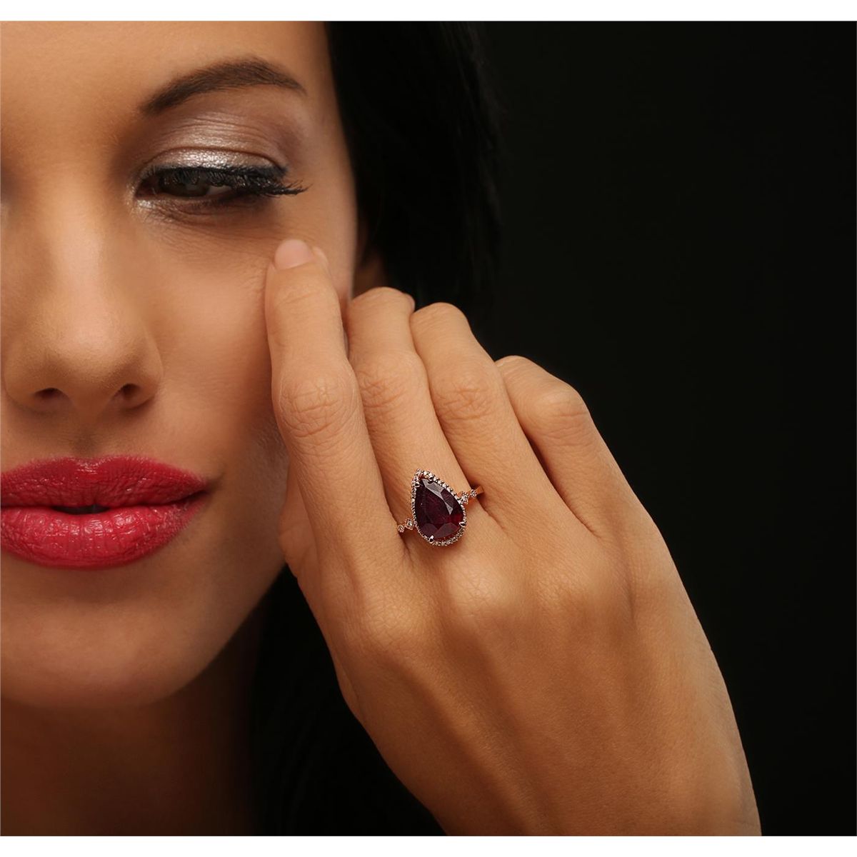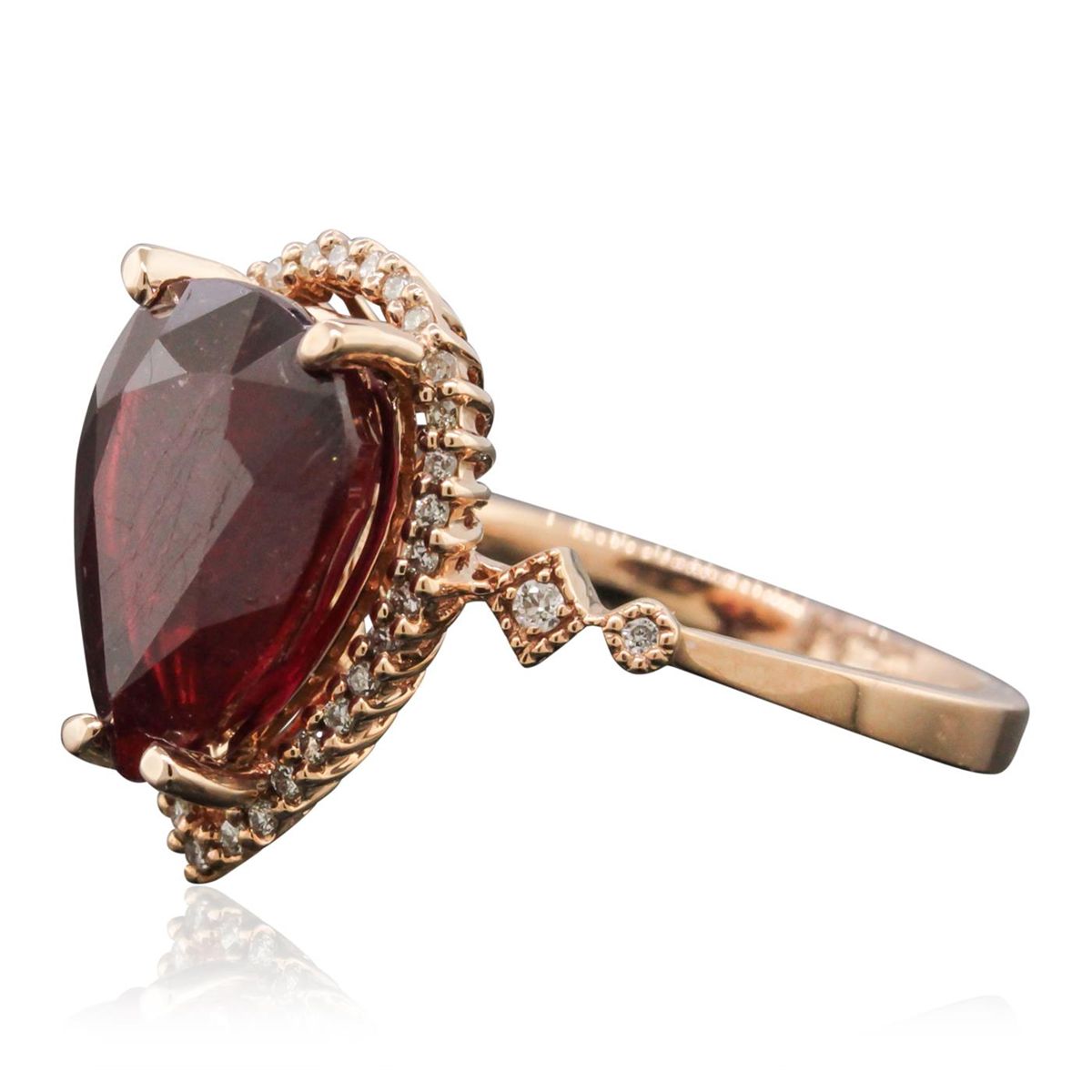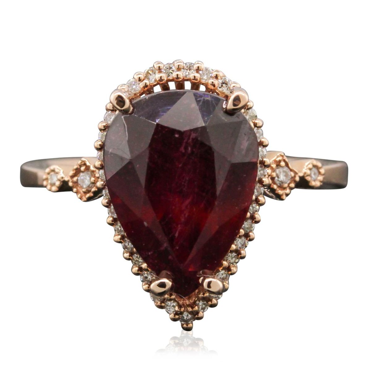 One electronically tested 14KT rose gold Ladies combination cast & assembled ring with a bright polish finish. Condition is new. Identified with markings of "K14". Containing: One prong set pear modified brilliant cut natural ruby, measuring 11.80 x 8.90 x 5.48mm, approximate. Total Weight of 4.60ct., clarity is heavily included, type II, medium dark, moderately strong, strongly purplish red color, (GIA stpR 6/4), cut is good. Thirty-Seven prong set round brilliant cut diamonds, measuring 1.10 - 1.10 x 0.66mm (depth est.) approximate. Total Weight of 37 Stones = 0.18ct. Clarity: I-1 to I-2. Color: J - K, Cut is Good. Colored gemstones are presumed to have been subjected to commonly used enhancement processes. All diamonds and colored gemstones are graded in the mounting, unless otherwise stated. Total Weight of Colored Stones 4.60ct. Total Weight of Diamonds 0.18ct. Total Weight of Ring 3.90 grams. GGL Appraised at $3,310.00.