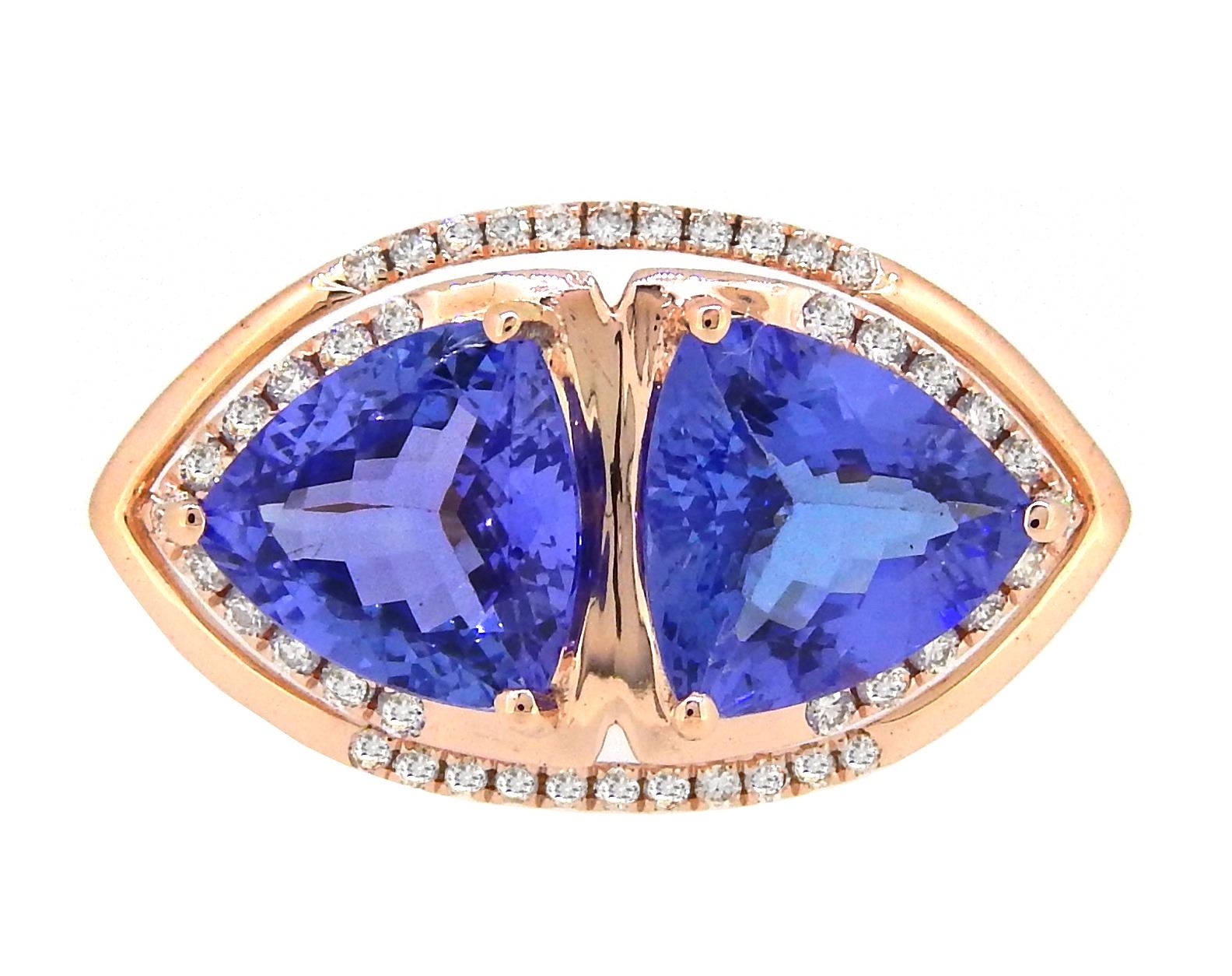 One 14KT Rose Gold 4.66ctw Tanzanite and Diamond Ring. (2) Tanzanite stones with a total weight of 4.66cts. (44) diamonds with a total weight of 0.31cts. Total weight of the ring is 6.1 grams.
