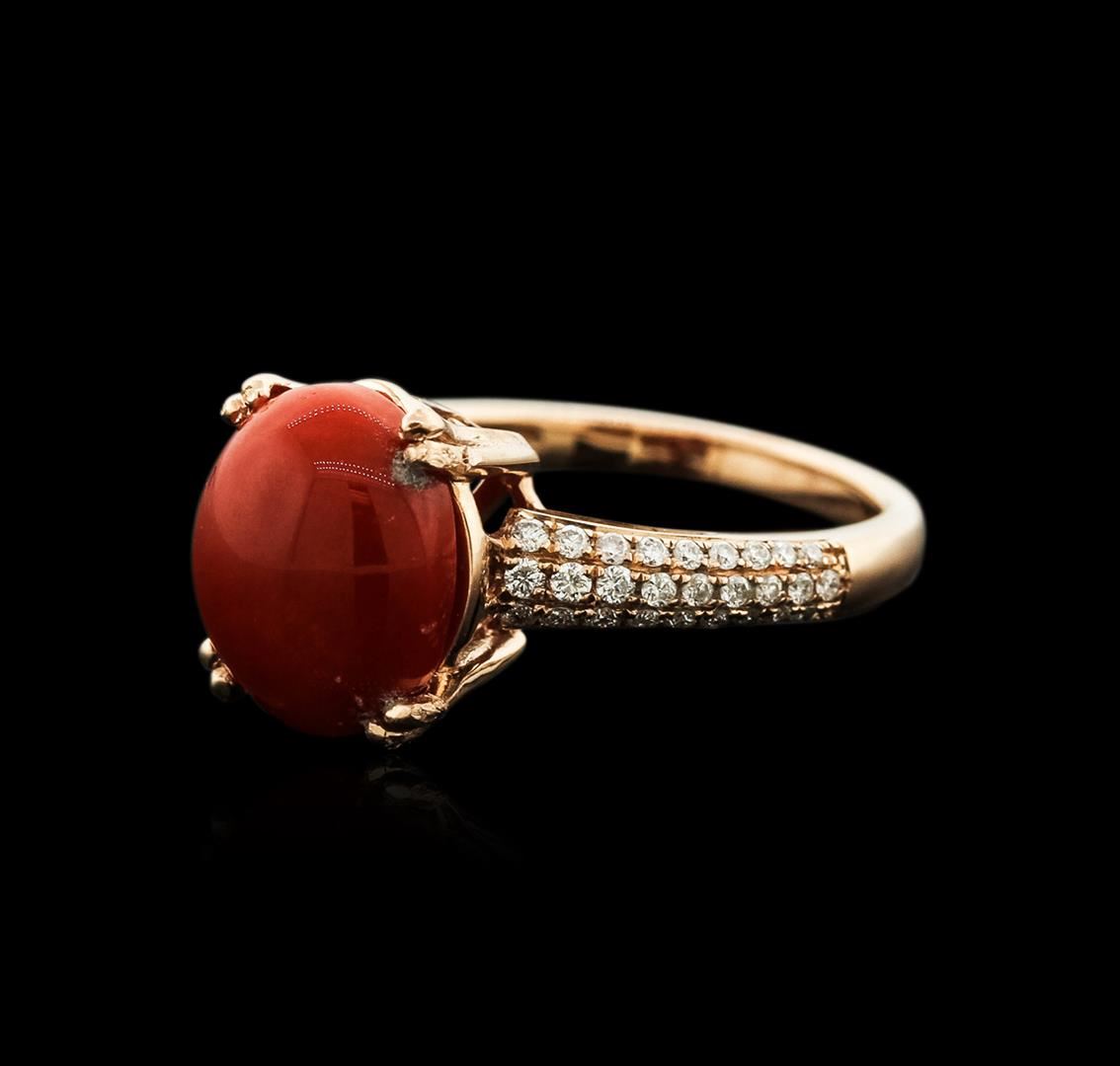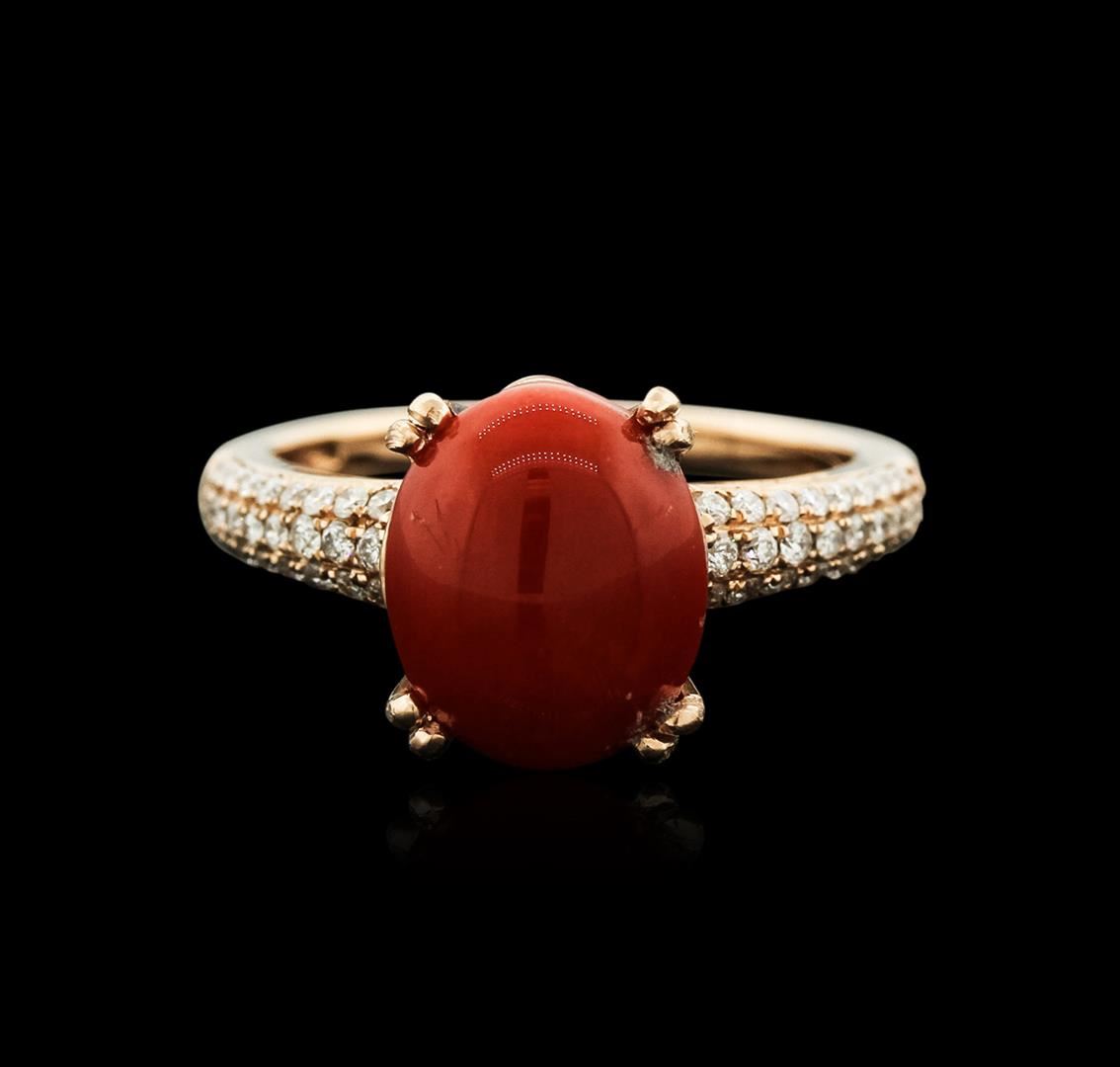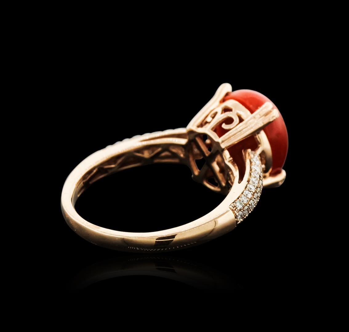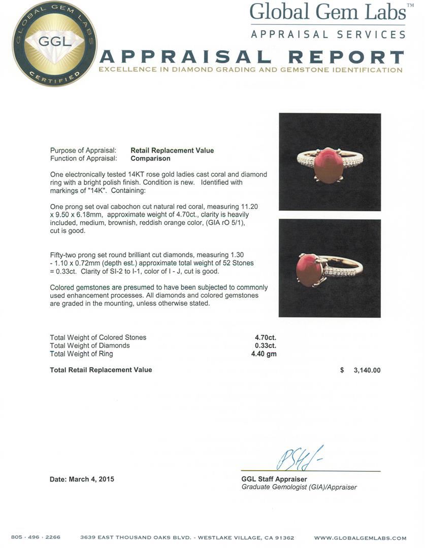 One electronically tested 14KT rose gold ladies cast coral and diamond ring with a bright polish finish. Identified with markings of "14K". Condition is new. Containing: One prong set oval cabochon cut natural red coral, measuring 11.20 x 9.50 x 6.18mm, approximate weight of 4.70ct., clarity is heavily included, medium, brownish, reddish orange color, (GIA rO 5/1), cut is good. Fifty-Two prong set round brilliant cut diamonds, measuring 1.30 - 1.10 x 0.72mm (depth est.) approximate total weight of 52 Stones = 0.33ct. Clarity: SI-2 to I-1. Color: I - J, Cut is Good. Colored gemstones are presumed to have been subjected to commonly used enhancement processes. All diamonds and colored gemstones are graded in the mounting, unless otherwise stated. Total Weight of Colored Stones 4.70ct. Total Weight of Diamonds 0.33ct. Total Weight of Ring 4.40 grams. GGL Appraised at $3,140.00.