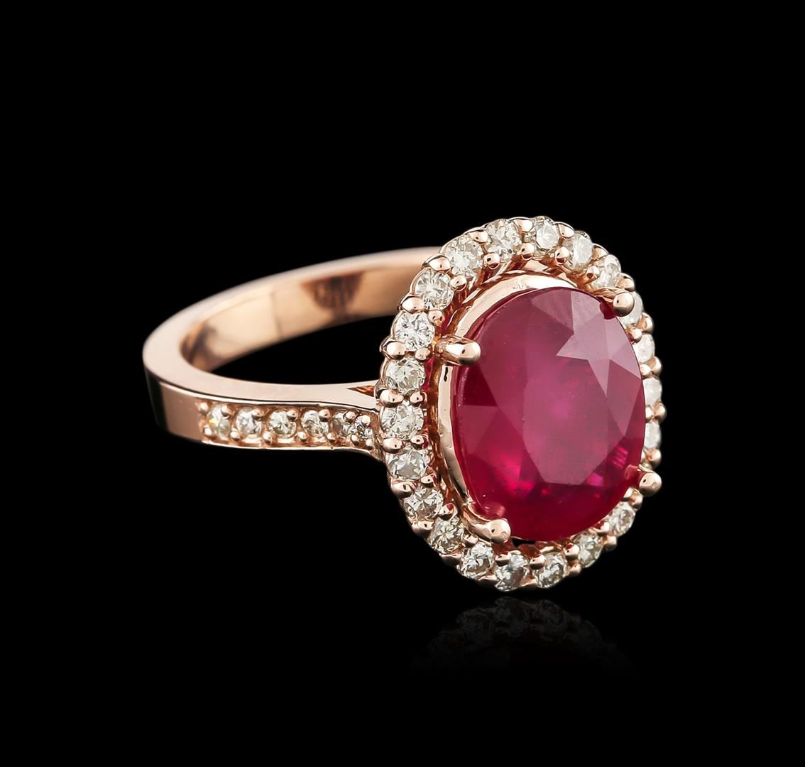 One electronically tested 14KT rose gold ladies cast ruby and diamond ring with a flat shank with a bright polish finish. Identified with markings of "K14". Condition is new. Containing: One prong set oval modified brilliant cut natural ruby, measuring 10.93 x 8.95 x 5.82mm, approximate weight of 4.78ct., clarity is heavily included, type II, medium dark, slightly brownish, strongly purplish red color, (GIA stpR 6/2), cut is good. Thirty-Four prong set round brilliant cut diamonds, measuring 1.30 - 1.30 x 0.78mm (depth est.) approximate total weight of 34 Stones = 0.27ct. Clarity: SI-2 to I-2. Color: J - K, Cut is Good. Diamonds and colored gemstones are graded in the mounting, unless otherwise stated. Colored gemstones are presumed to have been subjected to commonly used enhancement processes. Total Weight of Colored Stones 4.78ct. Total Weight of Diamonds 0.27ct. Total Weight of Ring 6.50 grams. GGL Appraised at $2,430.00.
