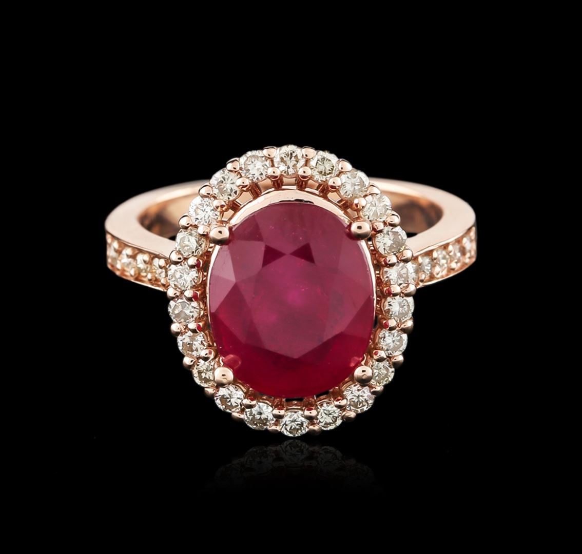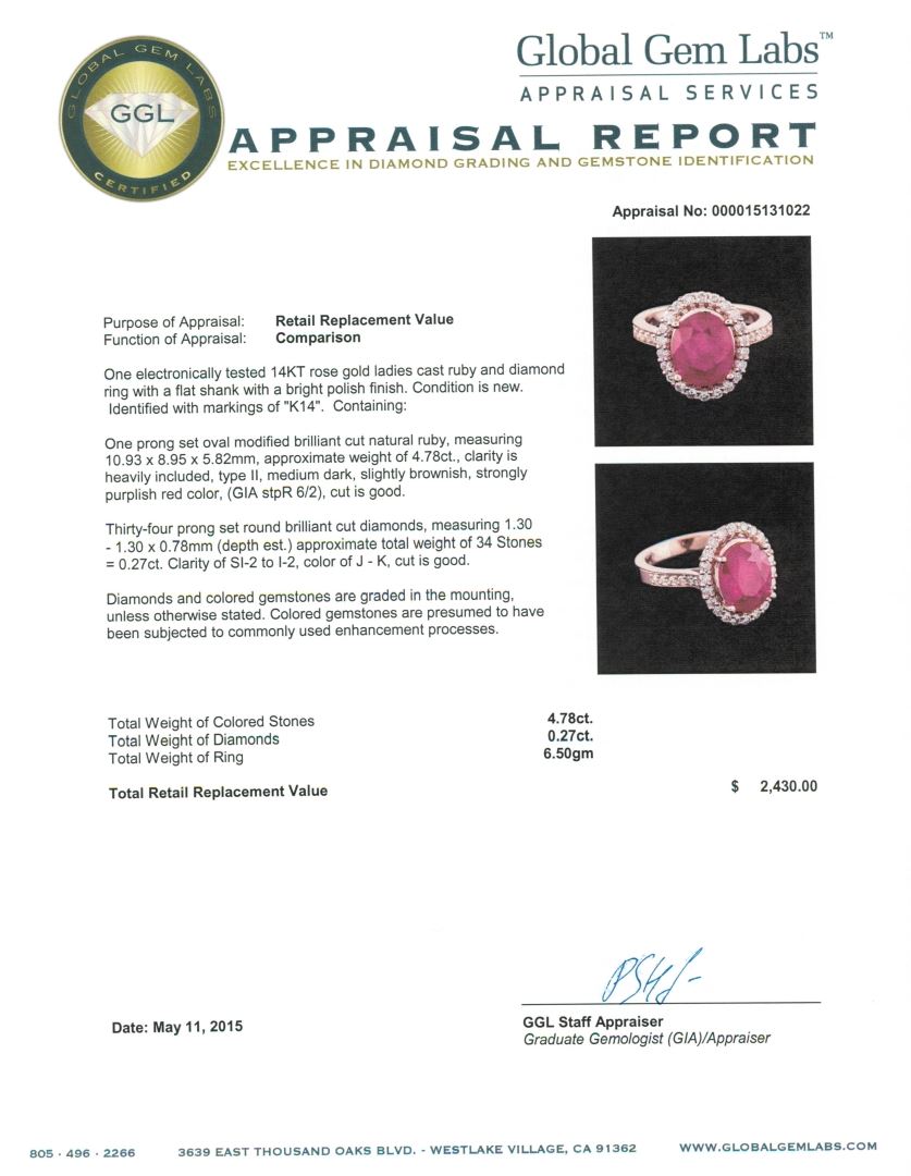 One electronically tested 14KT rose gold ladies cast ruby and diamond ring with a flat shank with a bright polish finish. Identified with markings of "K14". Condition is new. Containing: One prong set oval modified brilliant cut natural ruby, measuring 10.93 x 8.95 x 5.82mm, approximate weight of 4.78ct., clarity is heavily included, type II, medium dark, slightly brownish, strongly purplish red color, (GIA stpR 6/2), cut is good. Thirty-Four prong set round brilliant cut diamonds, measuring 1.30 - 1.30 x 0.78mm (depth est.) approximate total weight of 34 Stones = 0.27ct. Clarity: SI-2 to I-2. Color: J - K, Cut is Good. Diamonds and colored gemstones are graded in the mounting, unless otherwise stated. Colored gemstones are presumed to have been subjected to commonly used enhancement processes. Total Weight of Colored Stones 4.78ct. Total Weight of Diamonds 0.27ct. Total Weight of Ring 6.50 grams. GGL Appraised at $2,430.00.