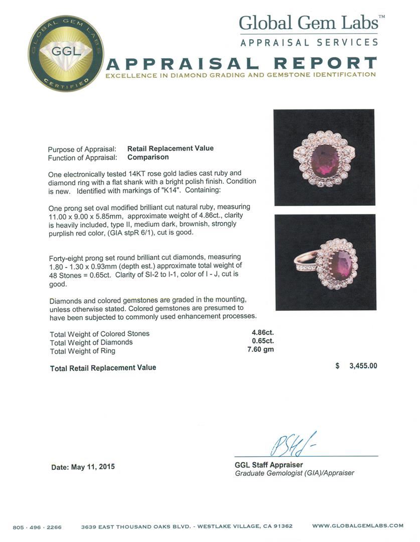 One electronically tested 14KT rose gold ladies cast ruby and diamond ring with a flat shank with a bright polish finish. Identified with markings of "K14". Condition is new. Containing: One prong set oval modified brilliant cut natural ruby, measuring 11.00 x 9.00 x 5.85mm, approximate weight of 4.86ct., clarity is heavily included, type II, medium dark, brownish, strongly purplish red color, (GIA stpR 6/1), cut is good. Forty-Eight prong set round brilliant cut diamonds, measuring 1.80 - 1.30 x 0.93mm (depth est.) approximate total weight of 48 Stones = 0.65ct. Clarity: SI-2 to I-1. Color: I - J, Cut is Good. Diamonds and colored gemstones are graded in the mounting, unless otherwise stated. Colored gemstones are presumed to have been subjected to commonly used enhancement processes. Total Weight of Colored Stones 4.86ct. Total Weight of Diamonds 0.65ct. Total Weight of Ring 7.60 grams. GGL Appraised at $3,455.00.