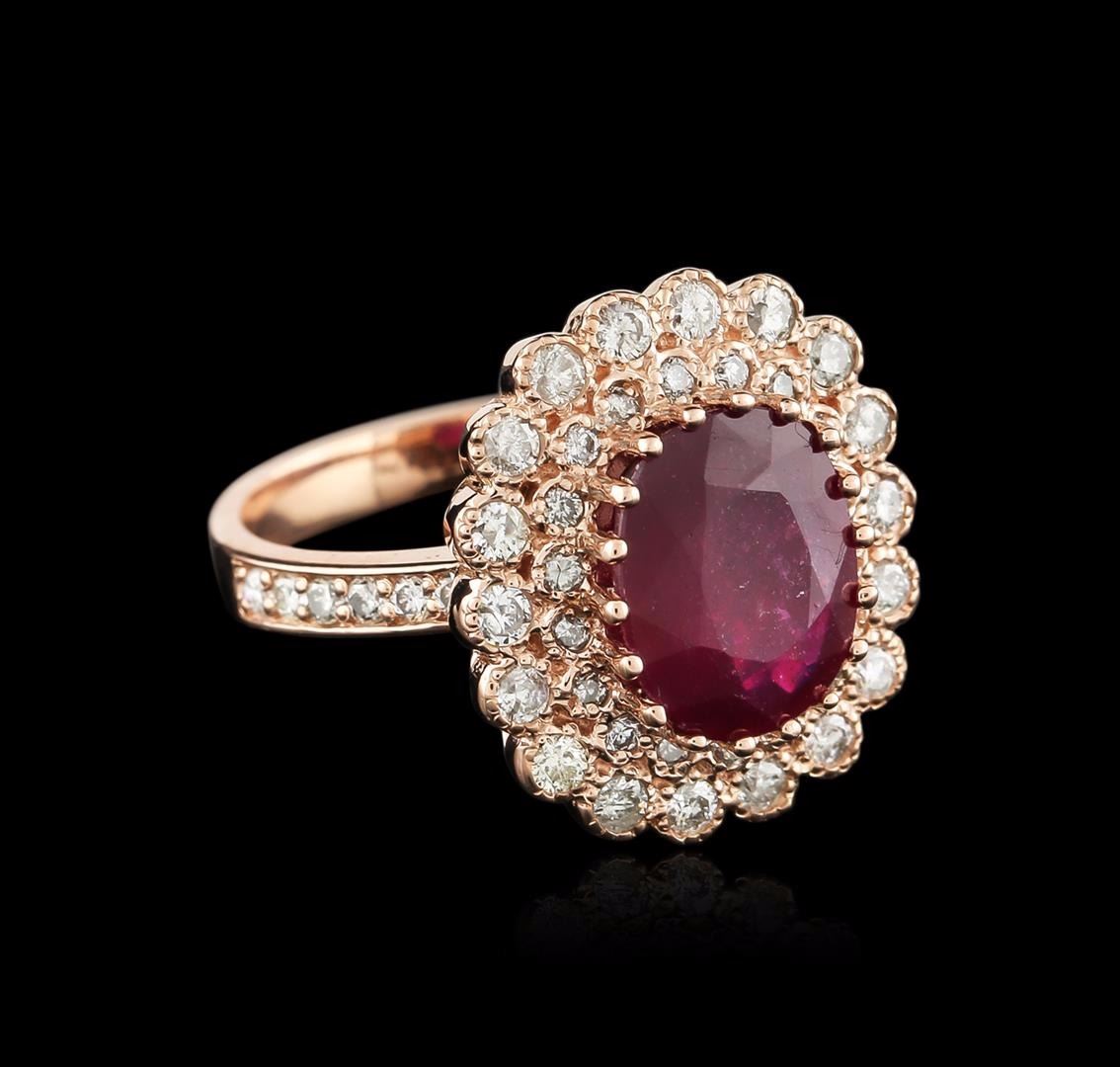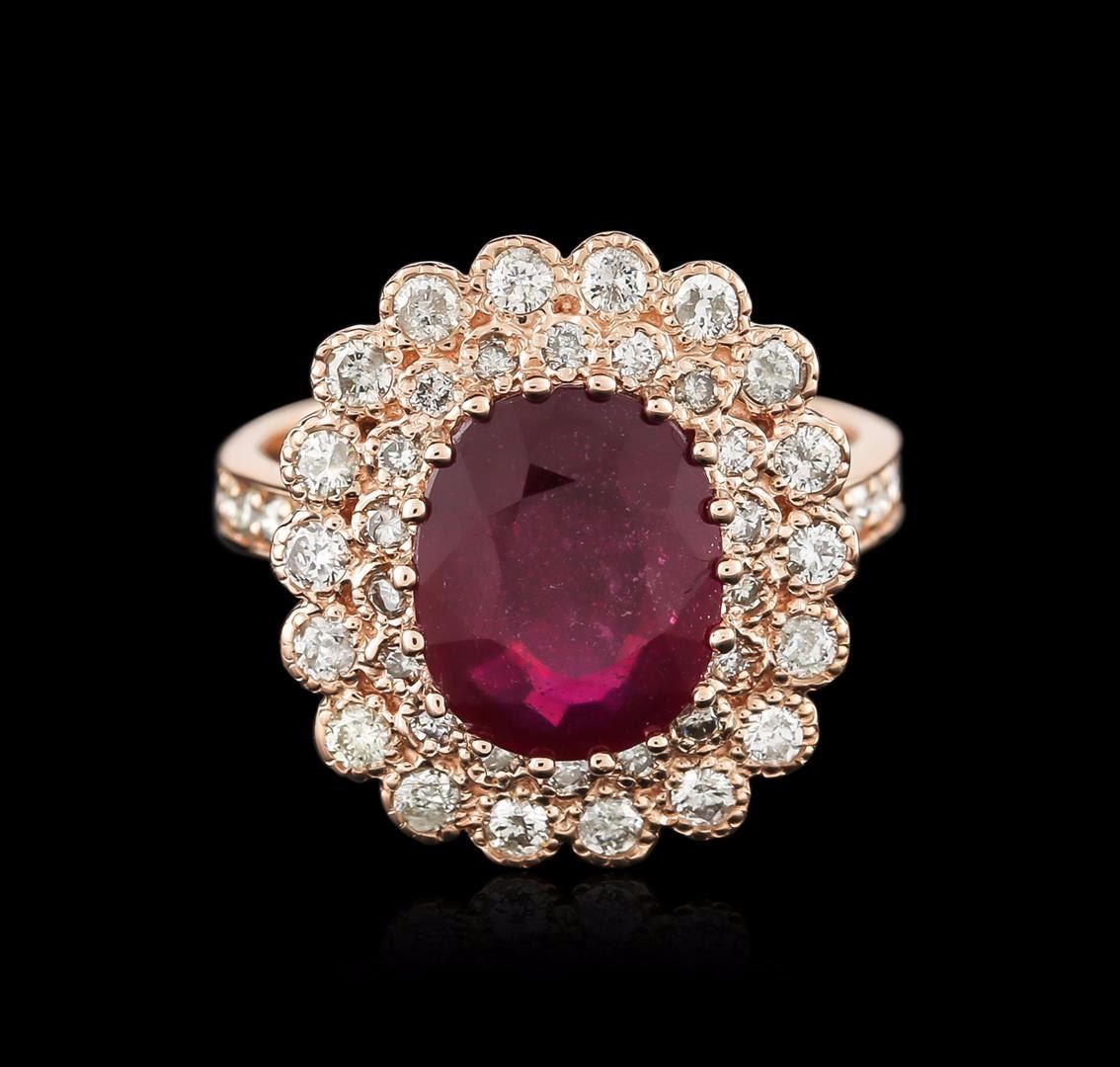 One electronically tested 14KT rose gold ladies cast ruby and diamond ring with a flat shank with a bright polish finish. Identified with markings of "K14". Condition is new. Containing: One prong set oval modified brilliant cut natural ruby, measuring 11.00 x 9.00 x 5.85mm, approximate weight of 4.86ct., clarity is heavily included, type II, medium dark, brownish, strongly purplish red color, (GIA stpR 6/1), cut is good. Forty-Eight prong set round brilliant cut diamonds, measuring 1.80 - 1.30 x 0.93mm (depth est.) approximate total weight of 48 Stones = 0.65ct. Clarity: SI-2 to I-1. Color: I - J, Cut is Good. Diamonds and colored gemstones are graded in the mounting, unless otherwise stated. Colored gemstones are presumed to have been subjected to commonly used enhancement processes. Total Weight of Colored Stones 4.86ct. Total Weight of Diamonds 0.65ct. Total Weight of Ring 7.60 grams. GGL Appraised at $3,455.00.
