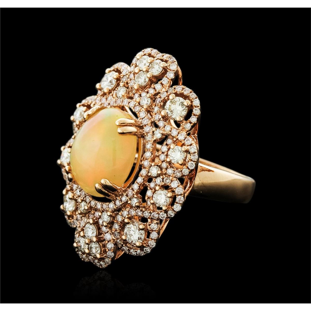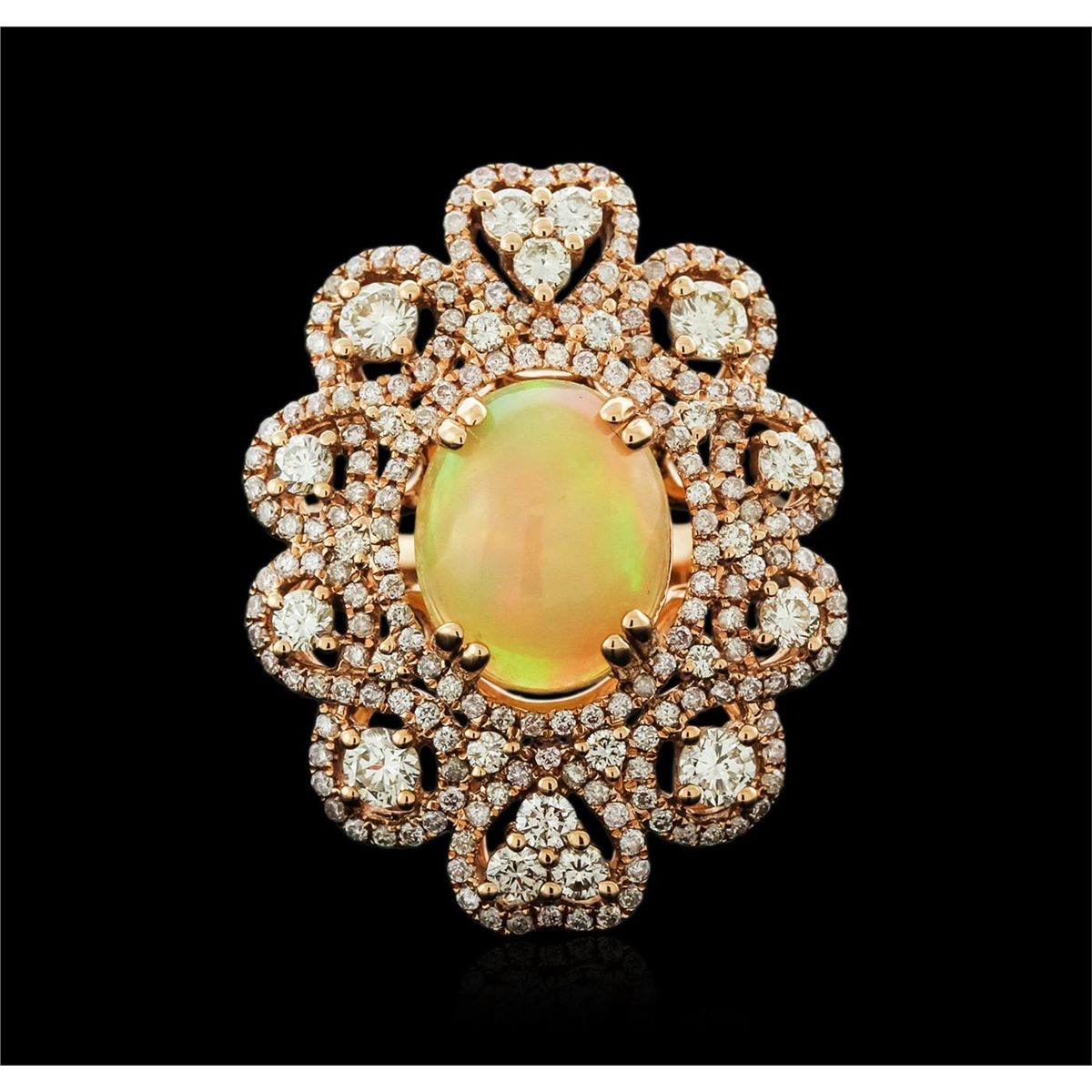 One electronically tested 14KT rose gold ladies cast opal and diamond ring with a bright polish finish. Identified with markings of "14K". Condition is new. Containing: One orange opal that is cut in a oval shaped cabochon and is prong set, measuring 12.00. mm long x 9.80 mm wide, and 6.78 mm thick and the approximate weight is 4.97 carats. The opal has a somewhat bright, multicolor play of color (fire) in a flashfire pattern; a high dome; a good cut; no inclusions; slight variation in base in its brightness and pattern; and is somewhat directional. Twenty-Four prong set round brilliant cut diamonds, measuring 2.80 - 2.00. x 1.44mm (depth est.) approximate total weight of 24 Stones = 1.21ct. Clarity: SI-1. Color: J - K, Cut is Good. One Hundred Twenty-Six prong set round brilliant cut diamonds, measuring 1.00. - 1.00. x 0.60mm (depth est.) approximate total weight of 126 Stones = 0.45ct. Clarity: SI-2 to I-1. Color: I - J, Cut is Good. Colored gemstones are presumed to have been subjected to commonly used enhancement processes. All diamonds and colored gemstones are graded in the mounting, unless otherwise stated. Total Weight of Opals 4.97ct. Total Weight of Diamonds 1.67ct. Total Weight of Ring 10.10 grams. GGL Appraised at $4,930.00.