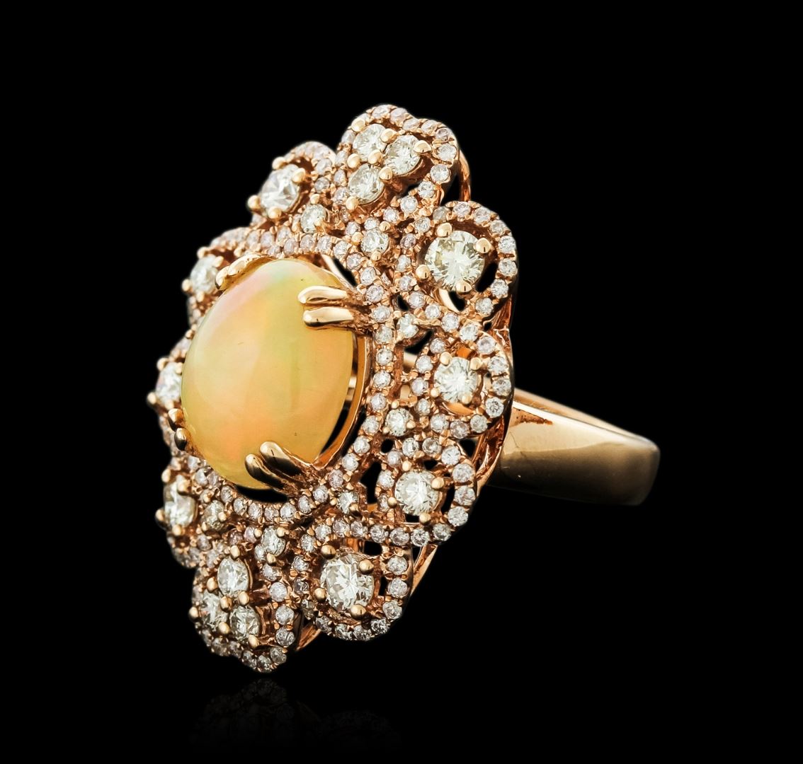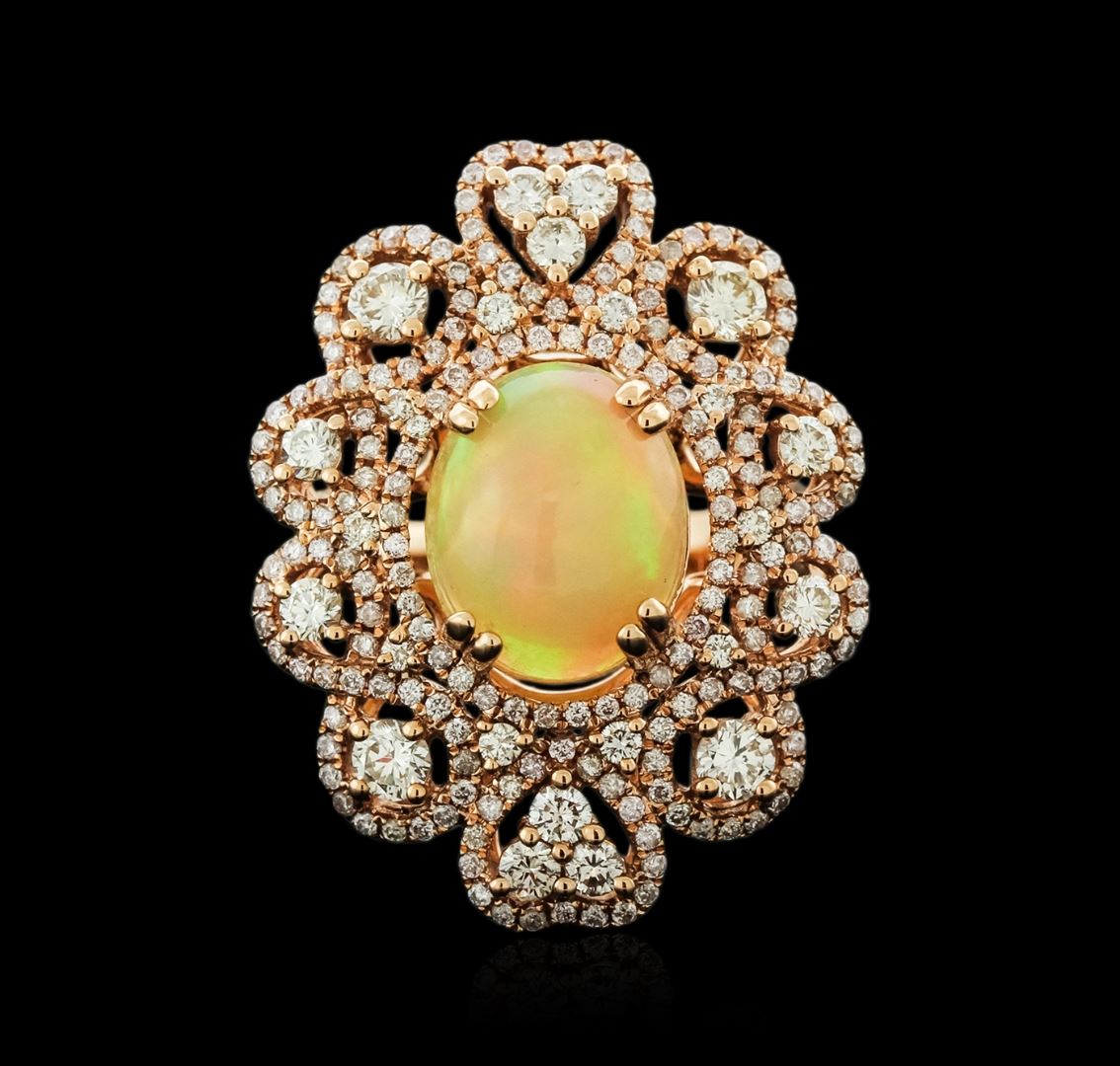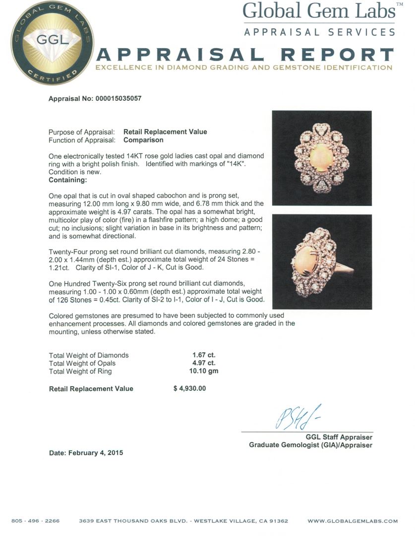 One electronically tested 14KT rose gold ladies cast opal and diamond ring with a bright polish finish. Identified with markings of "14K". Condition is new. Containing: One orange opal that is cut in a oval shaped cabochon and is prong set, measuring 12.00. mm long x 9.80 mm wide, and 6.78 mm thick and the approximate weight is 4.97 carats. The opal has a somewhat bright, multicolor play of color (fire) in a flashfire pattern; a high dome; a good cut; no inclusions; slight variation in base in its brightness and pattern; and is somewhat directional. Twenty-Four prong set round brilliant cut diamonds, measuring 2.80 - 2.00. x 1.44mm (depth est.) approximate total weight of 24 Stones = 1.21ct. Clarity: SI-1. Color: J - K, Cut is Good. One Hundred Twenty-Six prong set round brilliant cut diamonds, measuring 1.00. - 1.00. x 0.60mm (depth est.) approximate total weight of 126 Stones = 0.45ct. Clarity: SI-2 to I-1. Color: I - J, Cut is Good. Colored gemstones are presumed to have been subjected to commonly used enhancement processes. All diamonds and colored gemstones are graded in the mounting, unless otherwise stated. Total Weight of Opals 4.97ct. Total Weight of Diamonds 1.67ct. Total Weight of Ring 10.10 grams. GGL Appraised at $4,930.00.