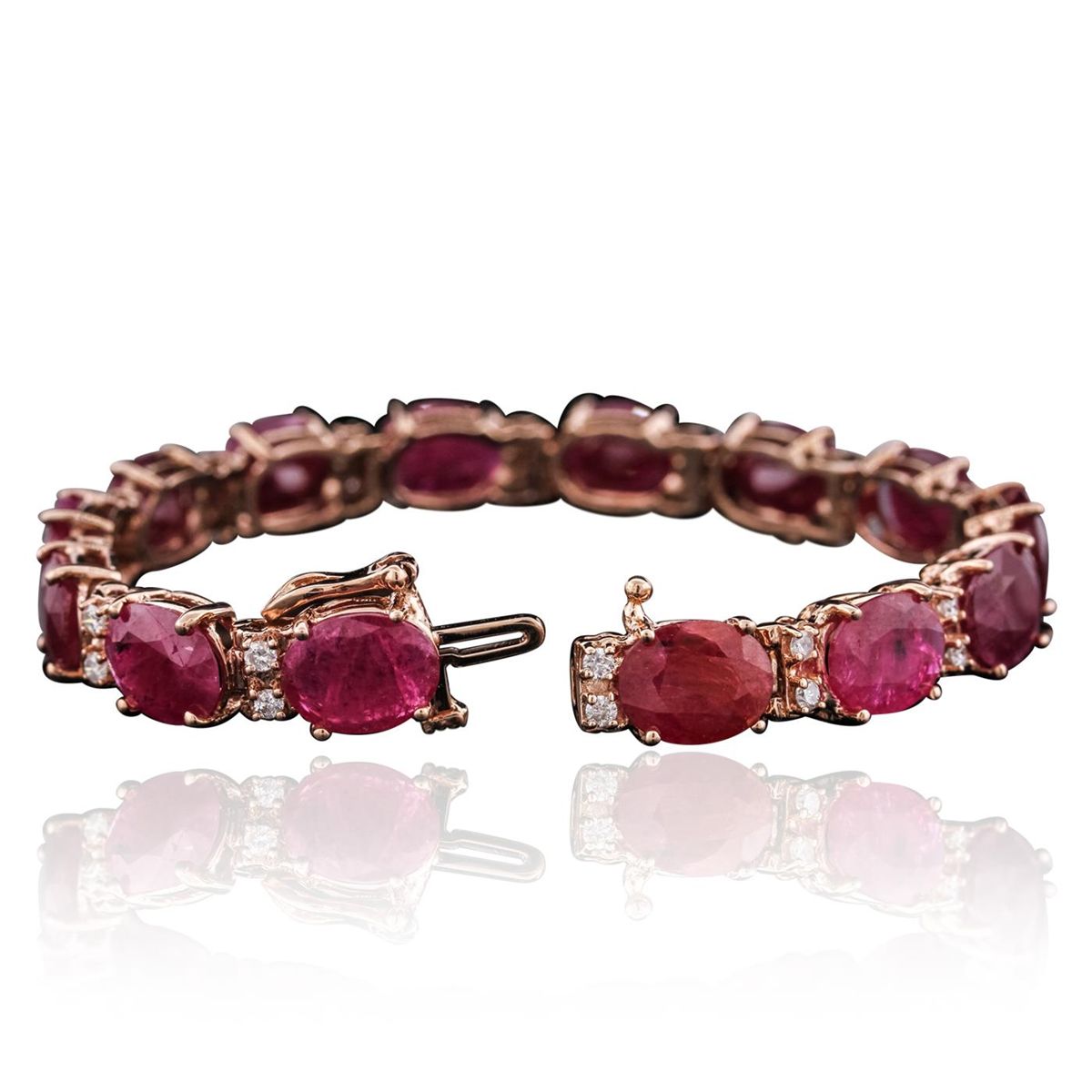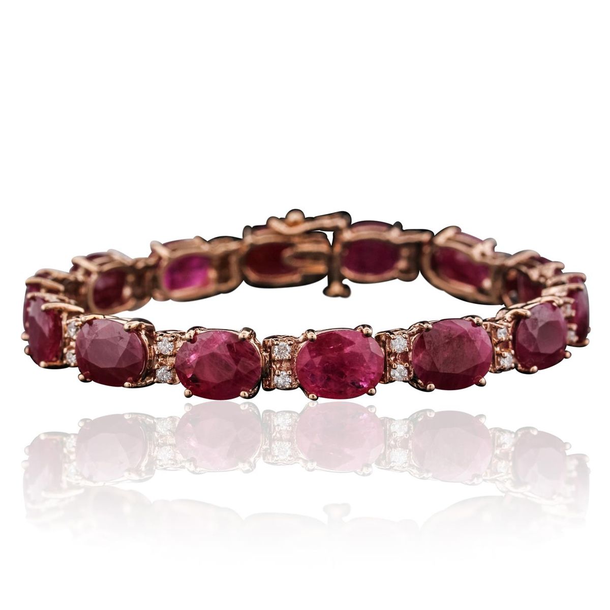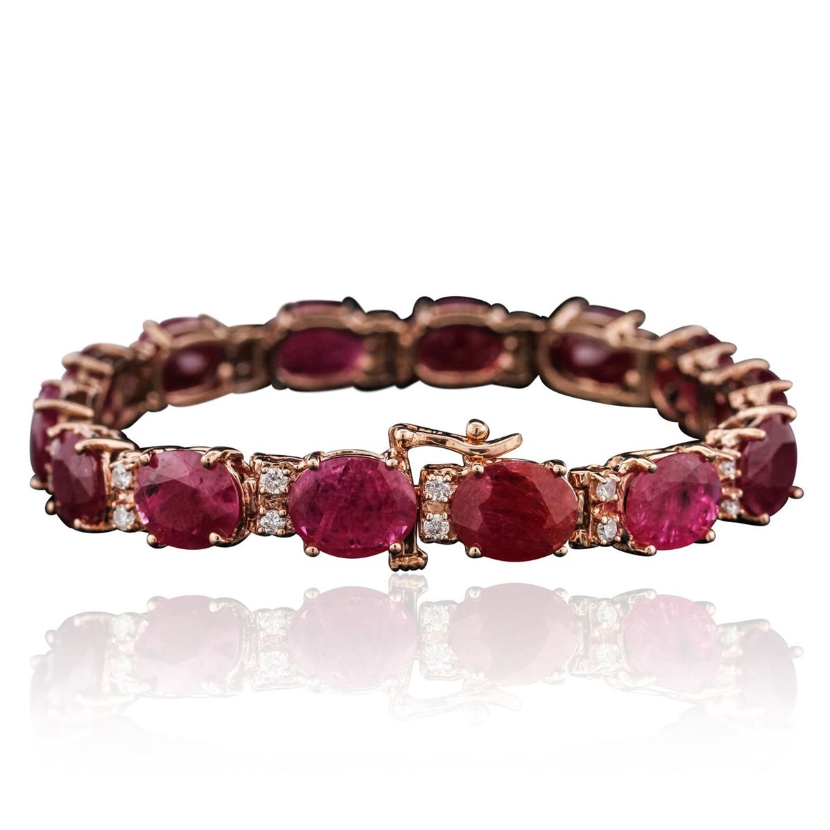 14KT Rose Gold 43.12ctw Ruby and Diamond Bracelet. One electronically tested 14KT rose gold ladies combination cast & assembled bracelet with a hidden box clasp with a bright polish finish. Measurements: 7" in length. Identified with markings of "14K". Condition is new. Containing: Fourteen prong set oval modified brilliant cut natural rubies, measuring 10.22 x 8.03 x 4.62mm, approximate total weight of 43.12ct., clarity is heavily included, type II, medium, moderately strong, strongly purplish red color, (GIA stpR 5/4), cut is good. Twenty-Eight prong set round brilliant cut diamonds, measuring 1.80 - 1.80 x 1.08mm (depth est.) approximate total weight of 28 Stones = 0.60ct. Clarity: I-1 to I-2. Color: G - H, Cut is Good. Colored gemstones are presumed to have been subjected to commonly used enhancement processes. All diamonds and colored gemstones are graded in the mounting, unless otherwise stated. Total Weight of Colored Stones 43.12ct. Total Weight of Diamonds 0.60ct. Total Weight of Bracelet 22.40 grams. GGL Appraised at $20,735.00.