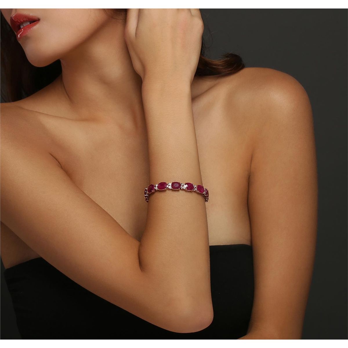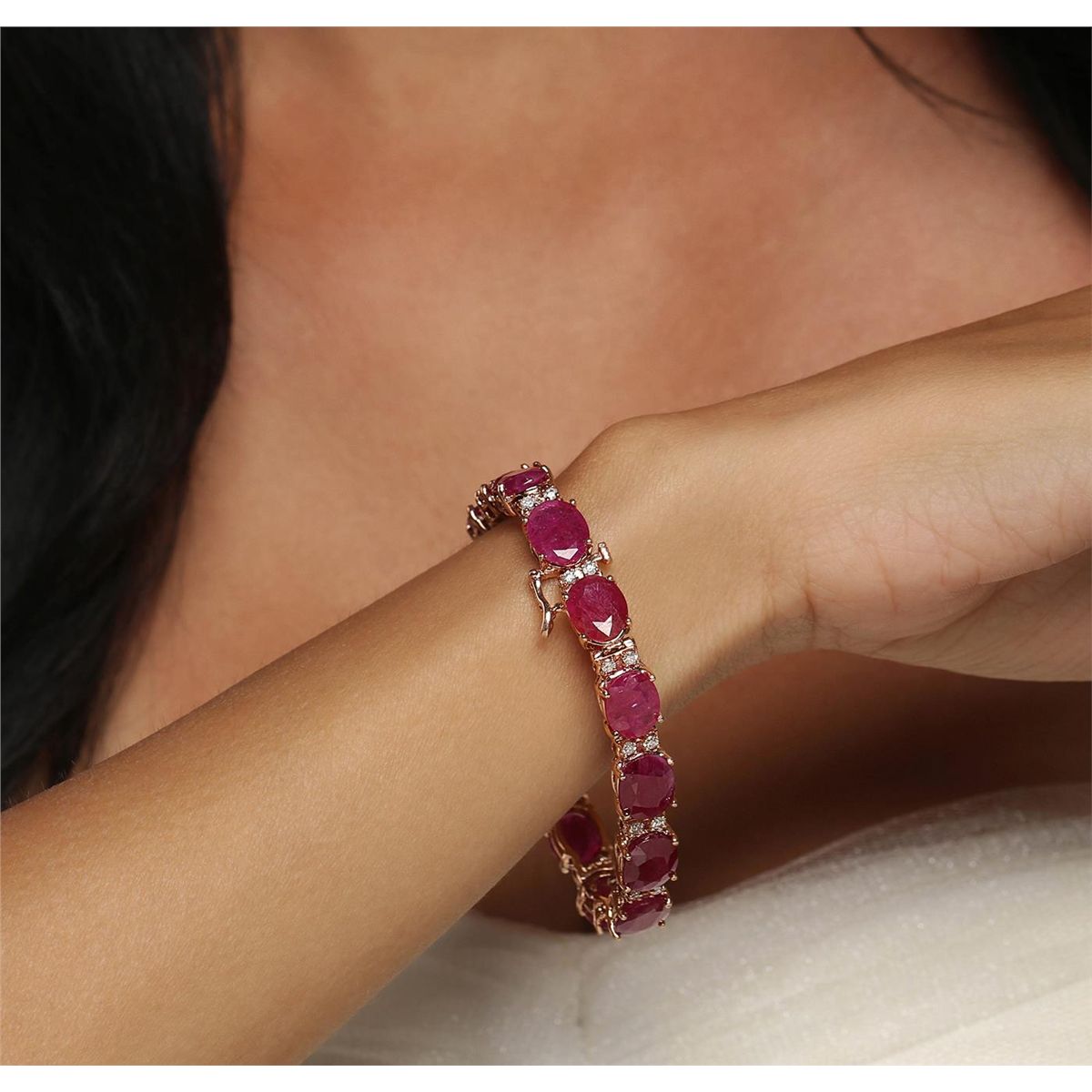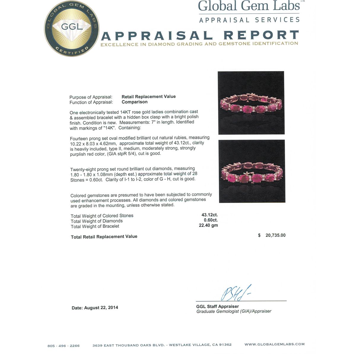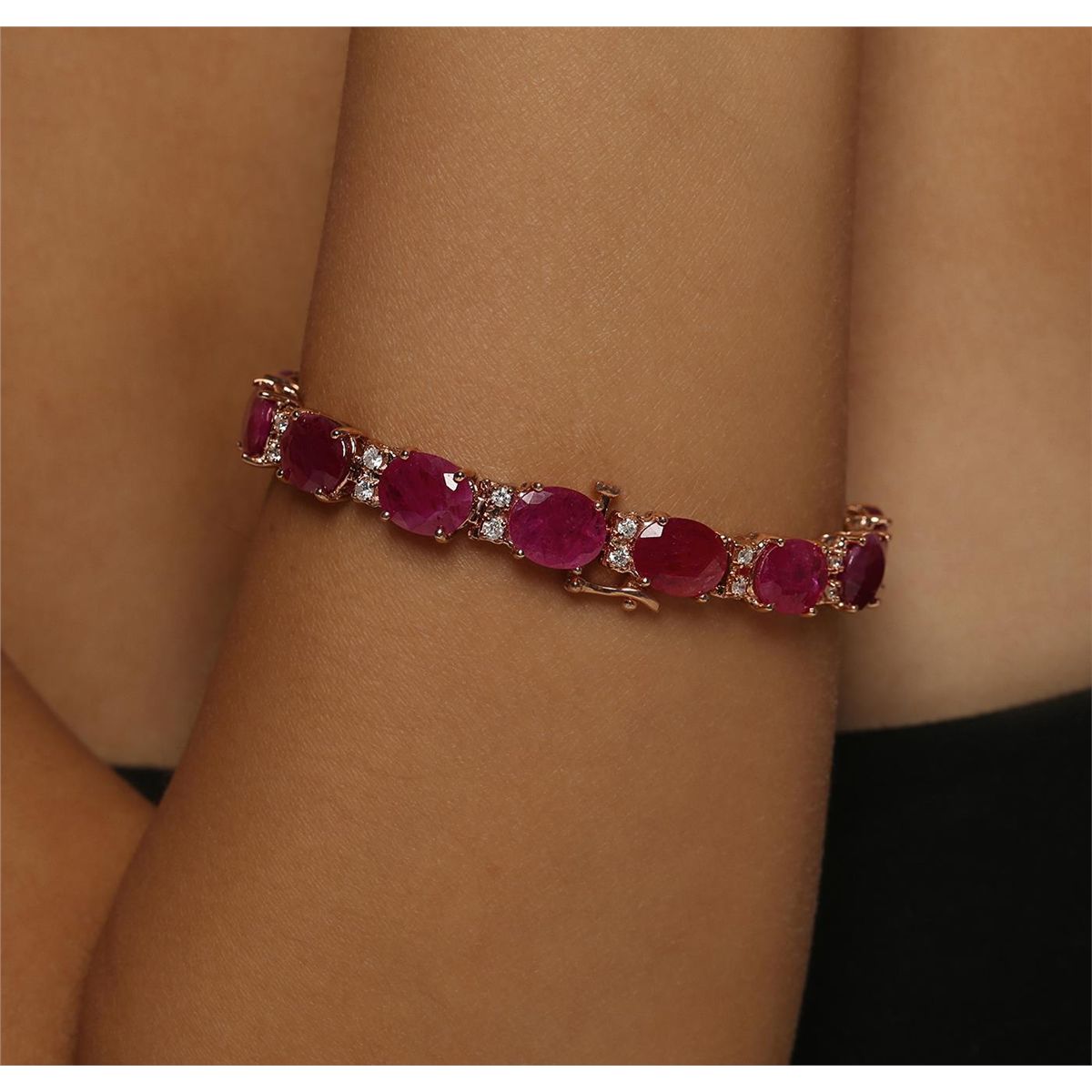 14KT Rose Gold 43.12ctw Ruby and Diamond Bracelet. One electronically tested 14KT rose gold ladies combination cast & assembled bracelet with a hidden box clasp with a bright polish finish. Measurements: 7" in length. Identified with markings of "14K". Condition is new. Containing: Fourteen prong set oval modified brilliant cut natural rubies, measuring 10.22 x 8.03 x 4.62mm, approximate total weight of 43.12ct., clarity is heavily included, type II, medium, moderately strong, strongly purplish red color, (GIA stpR 5/4), cut is good. Twenty-Eight prong set round brilliant cut diamonds, measuring 1.80 - 1.80 x 1.08mm (depth est.) approximate total weight of 28 Stones = 0.60ct. Clarity: I-1 to I-2. Color: G - H, Cut is Good. Colored gemstones are presumed to have been subjected to commonly used enhancement processes. All diamonds and colored gemstones are graded in the mounting, unless otherwise stated. Total Weight of Colored Stones 43.12ct. Total Weight of Diamonds 0.60ct. Total Weight of Bracelet 22.40 grams. GGL Appraised at $20,735.00.
