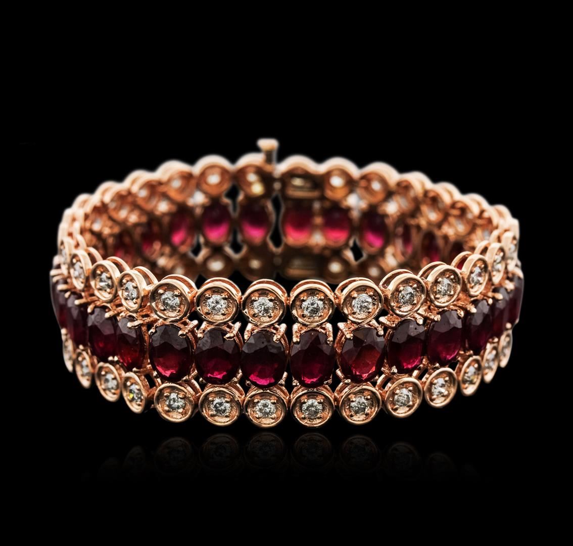 One electronically tested 14KT rose gold ladies cast & assembled ruby and diamond bracelet with a bright polish finish. Seven and one-quarter inch length bracelet features a flexible ruby ribbon supported by mirroring diamond ribbons, terminating in a concealed clasp. Condition is new, good workmanship. Containing: Thirty prong set oval mixed cut natural rubies, measuring 8.00 x 6.00 x 3.30mm, 15%. bulge factor, approximate total weight of 44.70ct., clarity is heavily included, type II, dark, very slightly brownish, slightly purplish red color, (GIA slpR 7/3), cut is good. Transmitting light somewhat diffusely, transparent to translucent. Naturally occurring internal & external characteristics are present. Indications of laboratory high temperature heat treatment, with glass & flux additives. Measurements & the color grade are an average for the group. Graded in the setting. Ruby has a low tolerance to rhodium plating, repolishing the surface, & ultrasonic cleaning. Sixty prong set round brilliant cut diamonds, measuring 2.90 - 2.80 x 1.71mm (depth est.) approximate total weight of 60 Stones = 5.18ct. Graded in the setting. Clarity: SI-2 to I-2. Color: H - J. Total Weight of Colored Stones 44.70ct. Total Weight of Diamonds 5.18ct. Total Weight of Bracelet 56.70 grams. AIG Appraised at $28,200.00.