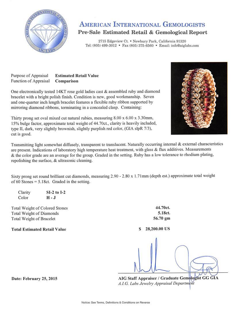 One electronically tested 14KT rose gold ladies cast & assembled ruby and diamond bracelet with a bright polish finish. Seven and one-quarter inch length bracelet features a flexible ruby ribbon supported by mirroring diamond ribbons, terminating in a concealed clasp. Condition is new, good workmanship. Containing: Thirty prong set oval mixed cut natural rubies, measuring 8.00 x 6.00 x 3.30mm, 15%. bulge factor, approximate total weight of 44.70ct., clarity is heavily included, type II, dark, very slightly brownish, slightly purplish red color, (GIA slpR 7/3), cut is good. Transmitting light somewhat diffusely, transparent to translucent. Naturally occurring internal & external characteristics are present. Indications of laboratory high temperature heat treatment, with glass & flux additives. Measurements & the color grade are an average for the group. Graded in the setting. Ruby has a low tolerance to rhodium plating, repolishing the surface, & ultrasonic cleaning. Sixty prong set round brilliant cut diamonds, measuring 2.90 - 2.80 x 1.71mm (depth est.) approximate total weight of 60 Stones = 5.18ct. Graded in the setting. Clarity: SI-2 to I-2. Color: H - J. Total Weight of Colored Stones 44.70ct. Total Weight of Diamonds 5.18ct. Total Weight of Bracelet 56.70 grams. AIG Appraised at $28,200.00.