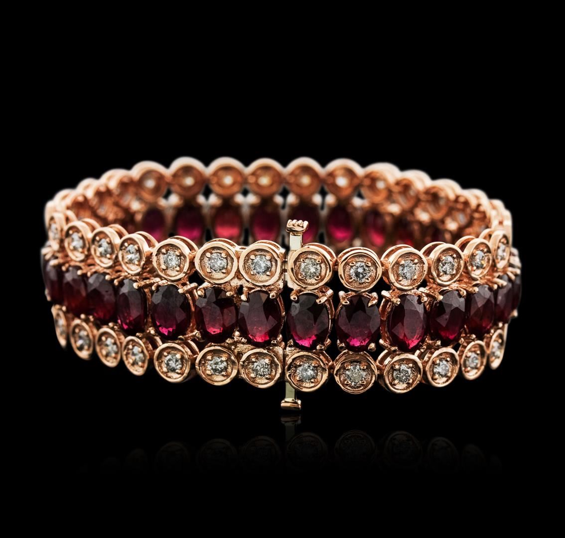 One electronically tested 14KT rose gold ladies cast & assembled ruby and diamond bracelet with a bright polish finish. Seven and one-quarter inch length bracelet features a flexible ruby ribbon supported by mirroring diamond ribbons, terminating in a concealed clasp. Condition is new, good workmanship. Containing: Thirty prong set oval mixed cut natural rubies, measuring 8.00 x 6.00 x 3.30mm, 15%. bulge factor, approximate total weight of 44.70ct., clarity is heavily included, type II, dark, very slightly brownish, slightly purplish red color, (GIA slpR 7/3), cut is good. Transmitting light somewhat diffusely, transparent to translucent. Naturally occurring internal & external characteristics are present. Indications of laboratory high temperature heat treatment, with glass & flux additives. Measurements & the color grade are an average for the group. Graded in the setting. Ruby has a low tolerance to rhodium plating, repolishing the surface, & ultrasonic cleaning. Sixty prong set round brilliant cut diamonds, measuring 2.90 - 2.80 x 1.71mm (depth est.) approximate total weight of 60 Stones = 5.18ct. Graded in the setting. Clarity: SI-2 to I-2. Color: H - J. Total Weight of Colored Stones 44.70ct. Total Weight of Diamonds 5.18ct. Total Weight of Bracelet 56.70 grams. AIG Appraised at $28,200.00.