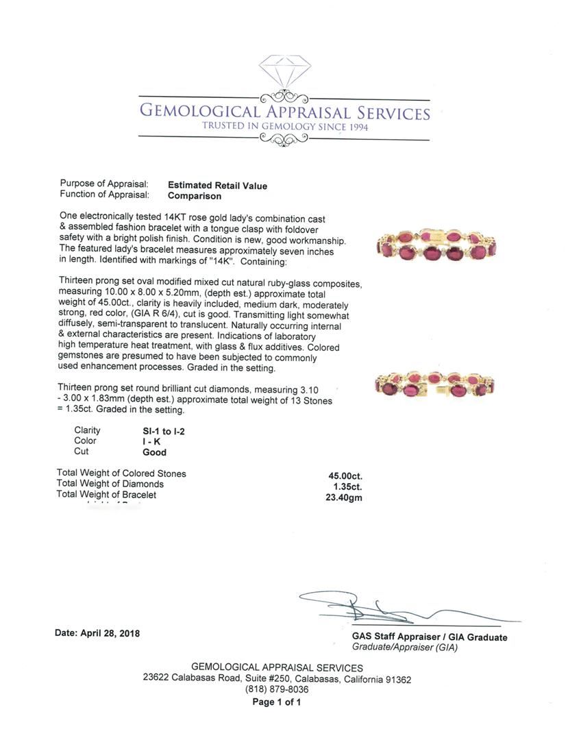 One electronically tested 14KT rose gold Ladies combination cast & assembled fashion bracelet with a tongue clasp with foldover safety with a bright polish finish. The featured Ladies bracelet measures approximately seven inches in length. Identified with markings of '14K'. Condition is new, good workmanship. Containing: Thirteen prong set oval modified mixed cut natural ruby-glass composites, measuring 10.00 x 8.00 x 5.20mm, (depth est.) approximate total weight of 45.00ct., clarity is heavily included, medium dark, moderately strong, red color, (GIA R 6/4), cut is good. Transmitting light somewhat diffusely, semi-transparent to translucent. Naturally occurring internal & external characteristics are present. Indications of laboratory high temperature heat treatment, with glass & flux additives. Colored gemstones are presumed to have been subjected to commonly used enhancement processes. Graded in the setting. Thirteen prong set round brilliant cut diamonds, measuring 3.10 - 3.00 x 1.83mm (depth est.) approximate total weight of 13 Stones = 1.35ct. Graded in the setting. Color I - K Clarity SI-1 to I-2 Cut Good. Total Weight of Colored Stones 45.00ct.. Total Weight of Diamonds 1.35ct.. Total Weight of Bracelet 23.40gm. GAS Appraised.