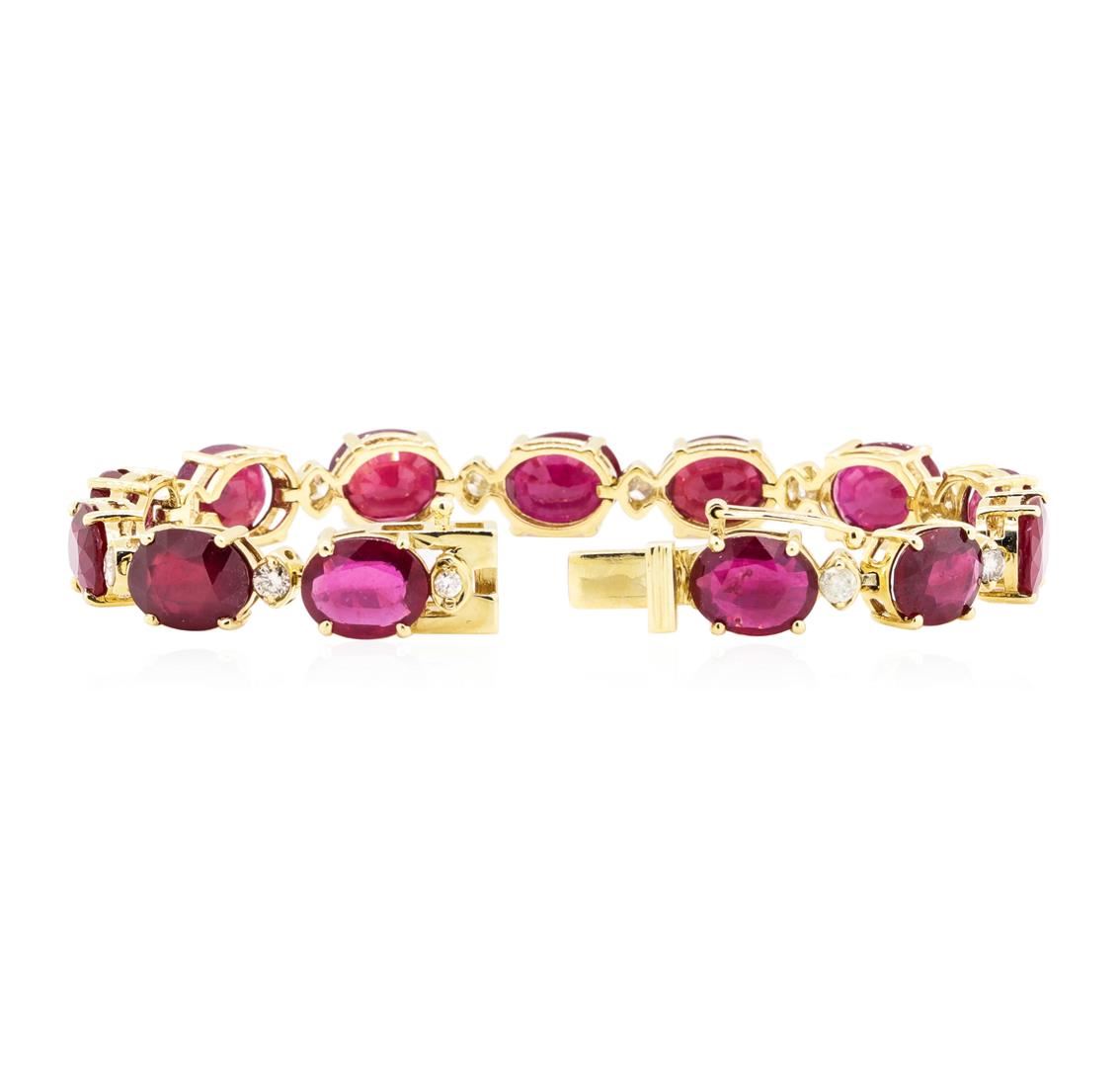 One electronically tested 14KT rose gold Ladies combination cast & assembled fashion bracelet with a tongue clasp with foldover safety with a bright polish finish. The featured Ladies bracelet measures approximately seven inches in length. Identified with markings of '14K'. Condition is new, good workmanship. Containing: Thirteen prong set oval modified mixed cut natural ruby-glass composites, measuring 10.00 x 8.00 x 5.20mm, (depth est.) approximate total weight of 45.00ct., clarity is heavily included, medium dark, moderately strong, red color, (GIA R 6/4), cut is good. Transmitting light somewhat diffusely, semi-transparent to translucent. Naturally occurring internal & external characteristics are present. Indications of laboratory high temperature heat treatment, with glass & flux additives. Colored gemstones are presumed to have been subjected to commonly used enhancement processes. Graded in the setting. Thirteen prong set round brilliant cut diamonds, measuring 3.10 - 3.00 x 1.83mm (depth est.) approximate total weight of 13 Stones = 1.35ct. Graded in the setting. Color I - K Clarity SI-1 to I-2 Cut Good. Total Weight of Colored Stones 45.00ct.. Total Weight of Diamonds 1.35ct.. Total Weight of Bracelet 23.40gm. GAS Appraised.