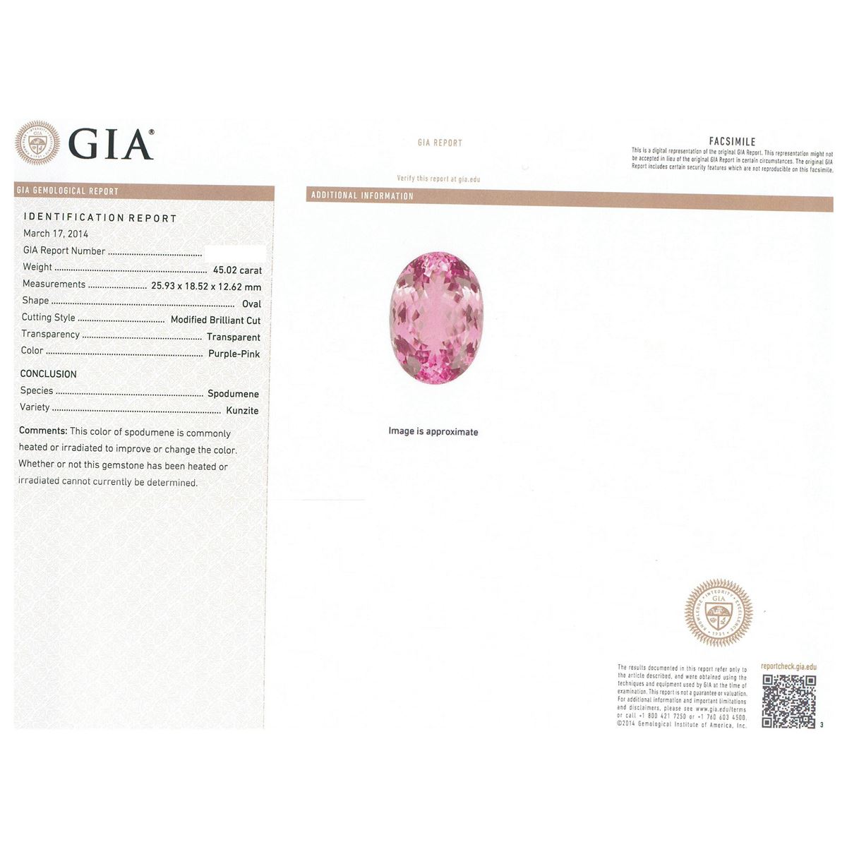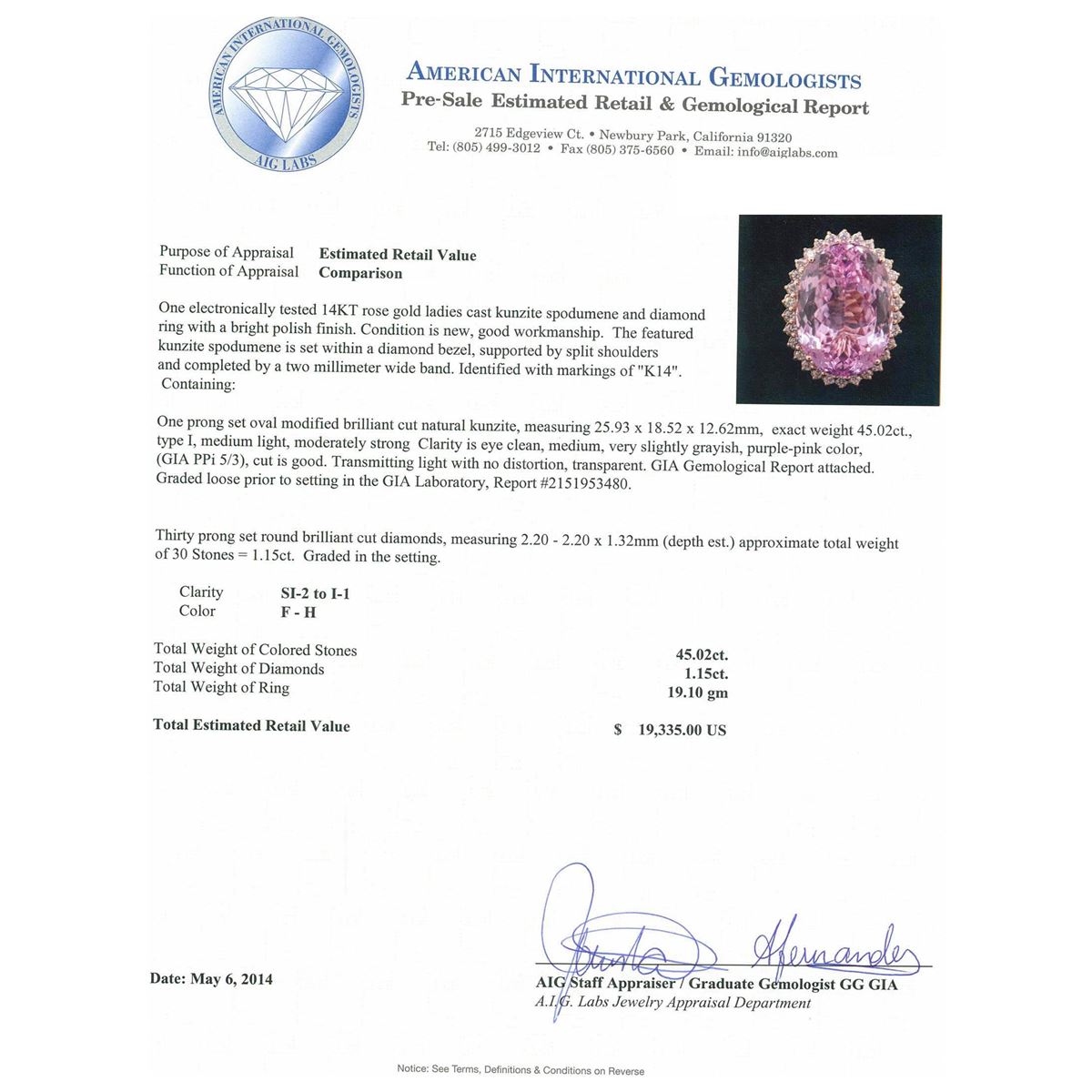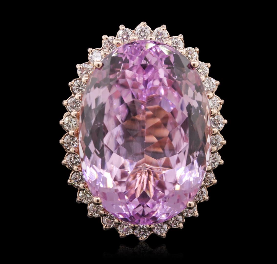 One electronically tested 14KT rose gold ladies cast kunzite spodumene and diamond ring with a bright polish finish. Condition is new, good workmanship. The featured kunzite spodumene is set within a diamond bezel, supported by split shoulders and completed by a two millimeter wide band. Identified with markings of "K14". Containing: One prong set oval modified brilliant cut natural kunzite, measuring 25.93 x 18.52 x 12.62mm, exact weight 45.02ct., type I, medium light, moderately strong Clarity is eye clean, medium, very slightly grayish, purple-pink color, (GIA PPi 5/3), cut is good. Transmitting light with no distortion, transparent. GIA Gemological Report attached. Graded loose prior to setting in the GIA Laboratory, Report #2151953480.Thirty prong set round brilliant cut diamonds, measuring 2.20 - 2.20 x 1.32mm (depth est.) approximate. Total Weight of 30 Stones = 1.15ct. Graded in the setting. Clarity: SI-2 to I-1. Color: F - H. Total Weight of Colored Stones 45.02ct. Total Weight of Diamonds 1.15ct. Total Weight of Ring 19.10 grams. AIG Appraised at $19,335.00.
