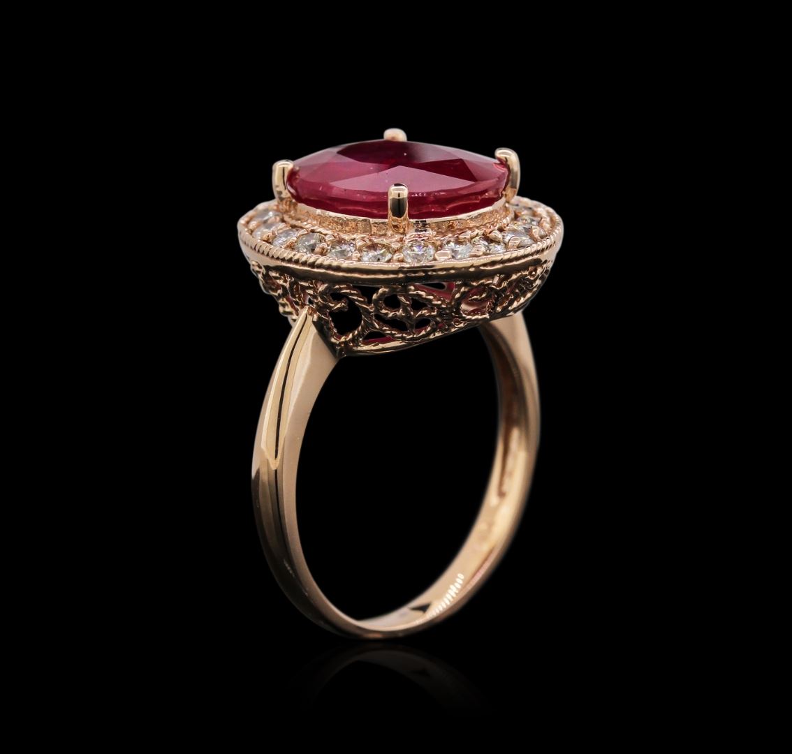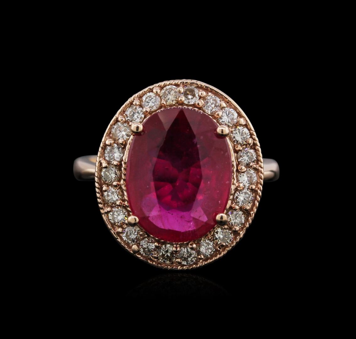 One electronically tested 14KT rose gold ladies cast ruby and diamond ring with a bright polish finish. Identified with markings of "K14". Condition is new. Containing: One prong set oval modified brilliant cut natural ruby, measuring 12.12 x 9.93 x 4.96mm, approximate weight of 5.01ct., clarity is heavily included, type II, medium dark, slightly brownish, strongly purplish red color, (GIA stpR 6/2), cut is good. Twenty-Two prong set round brilliant cut diamonds, measuring 1.70 - 1.70 x 1.02mm (depth est.) approximate total weight of 22 Stones = 0.39ct. Clarity: SI-2 to I-1. Color: J - K, Cut is Good. Diamonds and colored gemstones are graded in the mounting, unless otherwise stated. Colored gemstones are presumed to have been subjected to commonly used enhancement processes. Total Weight of Colored Stones 5.01ct. Total Weight of Diamonds 0.39ct. Total Weight of Ring 6.20 grams. GGL Appraised at $3,070.00.