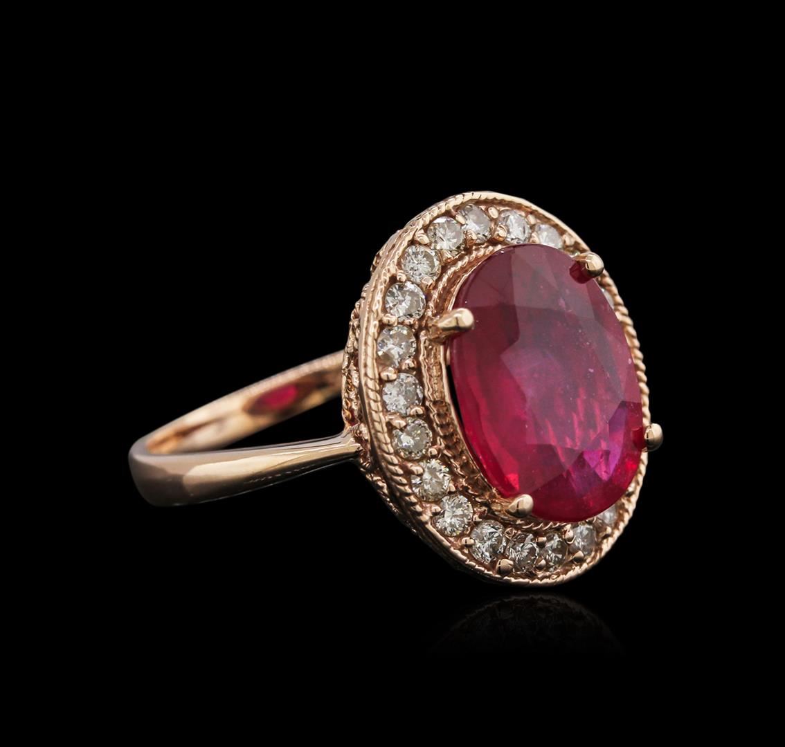 One electronically tested 14KT rose gold ladies cast ruby and diamond ring with a bright polish finish. Identified with markings of "K14". Condition is new. Containing: One prong set oval modified brilliant cut natural ruby, measuring 12.12 x 9.93 x 4.96mm, approximate weight of 5.01ct., clarity is heavily included, type II, medium dark, slightly brownish, strongly purplish red color, (GIA stpR 6/2), cut is good. Twenty-Two prong set round brilliant cut diamonds, measuring 1.70 - 1.70 x 1.02mm (depth est.) approximate total weight of 22 Stones = 0.39ct. Clarity: SI-2 to I-1. Color: J - K, Cut is Good. Diamonds and colored gemstones are graded in the mounting, unless otherwise stated. Colored gemstones are presumed to have been subjected to commonly used enhancement processes. Total Weight of Colored Stones 5.01ct. Total Weight of Diamonds 0.39ct. Total Weight of Ring 6.20 grams. GGL Appraised at $3,070.00.