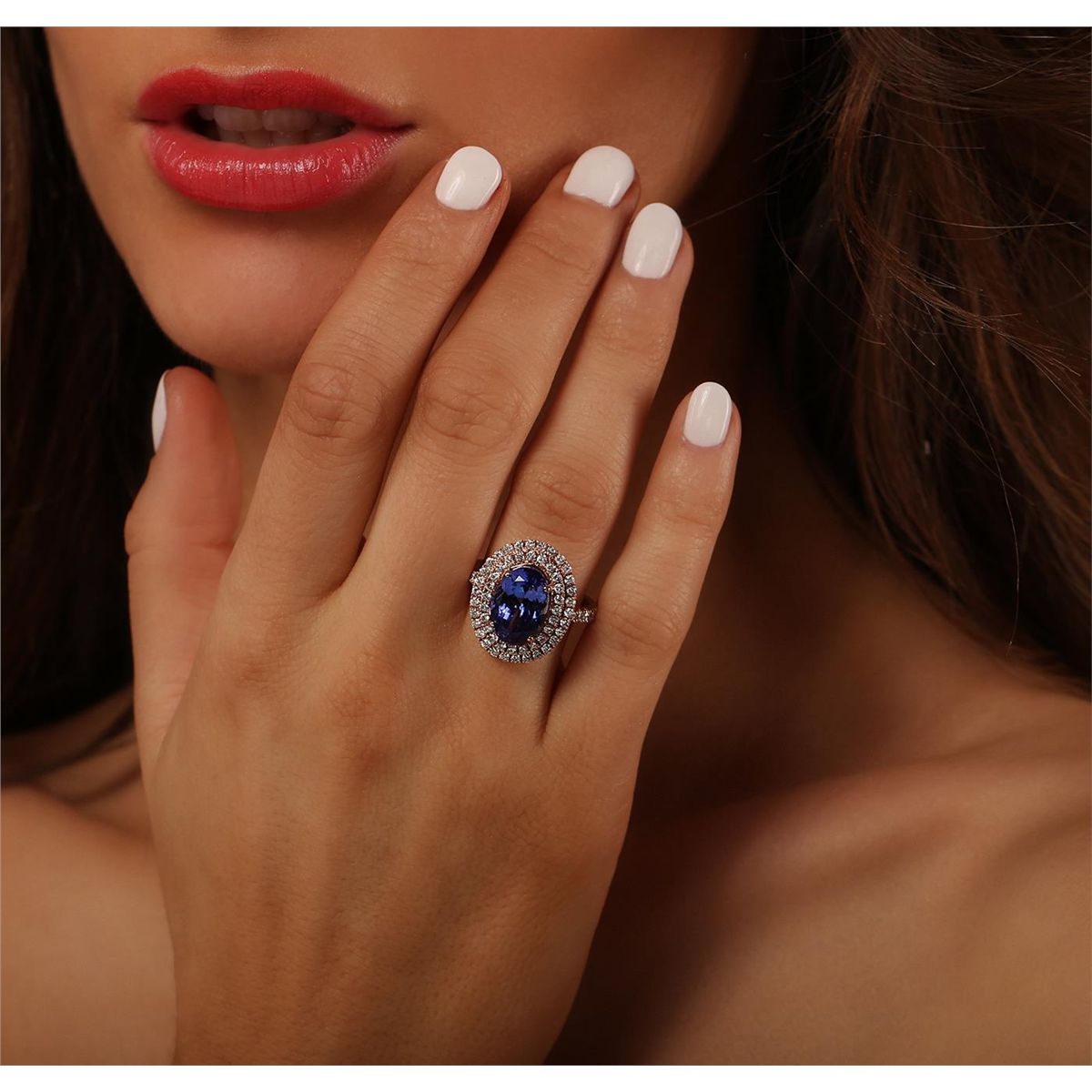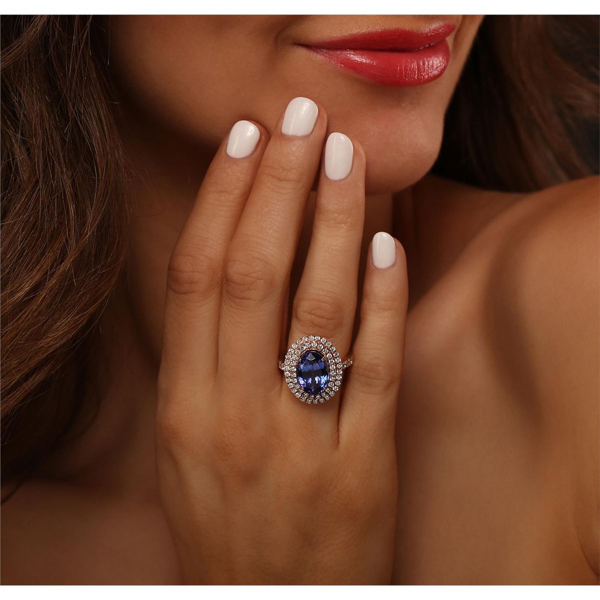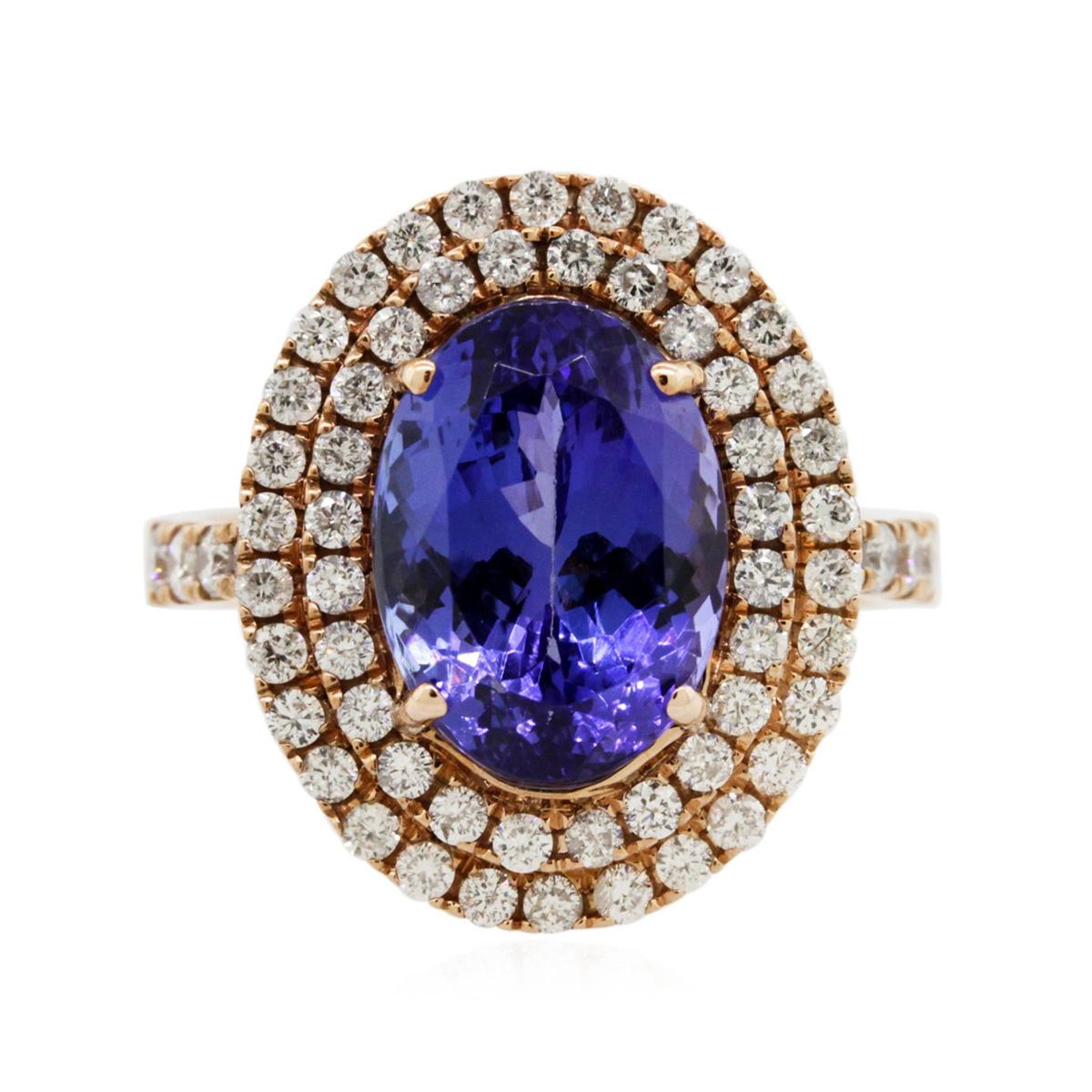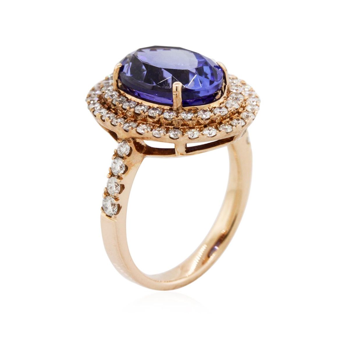 One electronically tested 14KT rose gold Ladies combination cast & assembled ring with a bright polish finish. Condition is new. Identified with markings of "14K". Containing: One prong set oval modified brilliant cut natural tanzanite, measuring 12.00 x 9.00 x 6.78mm, approximate weight of 5.01ct., clarity is eye clean, type I, medium, moderately strong, bluish violet color, (GIA bV 5/4), cut is good. Colored gemstones are presumed to have been subjected to commonly used color/clarity enhancement processes. Sixty-Four prong set round brilliant cut diamonds, measuring 1.60 - 1.30 x 0.87mm (depth est.) approximate. Total Weight of 64 Stones = 0.71ct. Clarity: I-1 to I-2. Color: H - I, Cut is Good. Total Weight of Colored Stones 5.01ct. Total Weight of Diamonds 0.71ct. Total Weight of Ring 7.30 grams. GGL Appraised at $10,590.00.