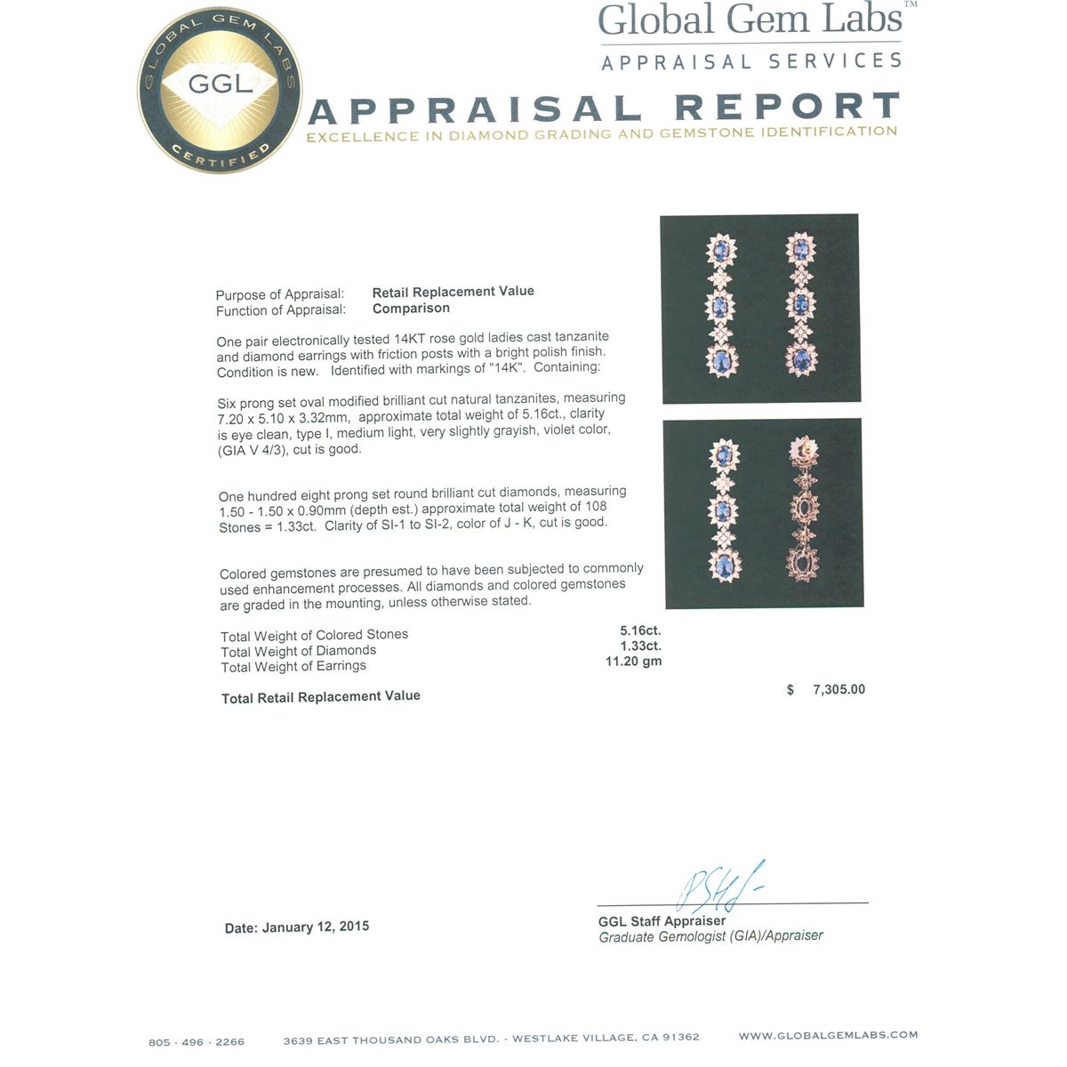 One pair electronically tested 14KT rose gold ladies cast tanzanite and diamond earrings with friction posts with a bright polish finish. Identified with markings of "14K". Condition is new. Containing: Six prong set oval modified brilliant cut natural tanzanites, measuring 7.20 x 5.10 x 3.32mm, approximate total weight of 5.16ct., clarity is eye clean, type I, medium light, very slightly grayish, violet color, (GIA V 4/3), cut is good. One Hundred Eight prong set round brilliant cut diamonds, measuring 1.50 - 1.50 x 0.90mm (depth est.) approximate total weight of 108 Stones = 1.33ct. Clarity: SI-1 to SI-2. Color: J - K, Cut is Good. Colored gemstones are presumed to have been subjected to commonly used enhancement processes. All diamonds and colored gemstones are graded in the mounting, unless otherwise stated. Total Weight of Colored Stones 5.16ct. Total Weight of Diamonds 1.33ct. Total Weight of Earrings 11.20 grams. GGL Appraised at $7,305.00.