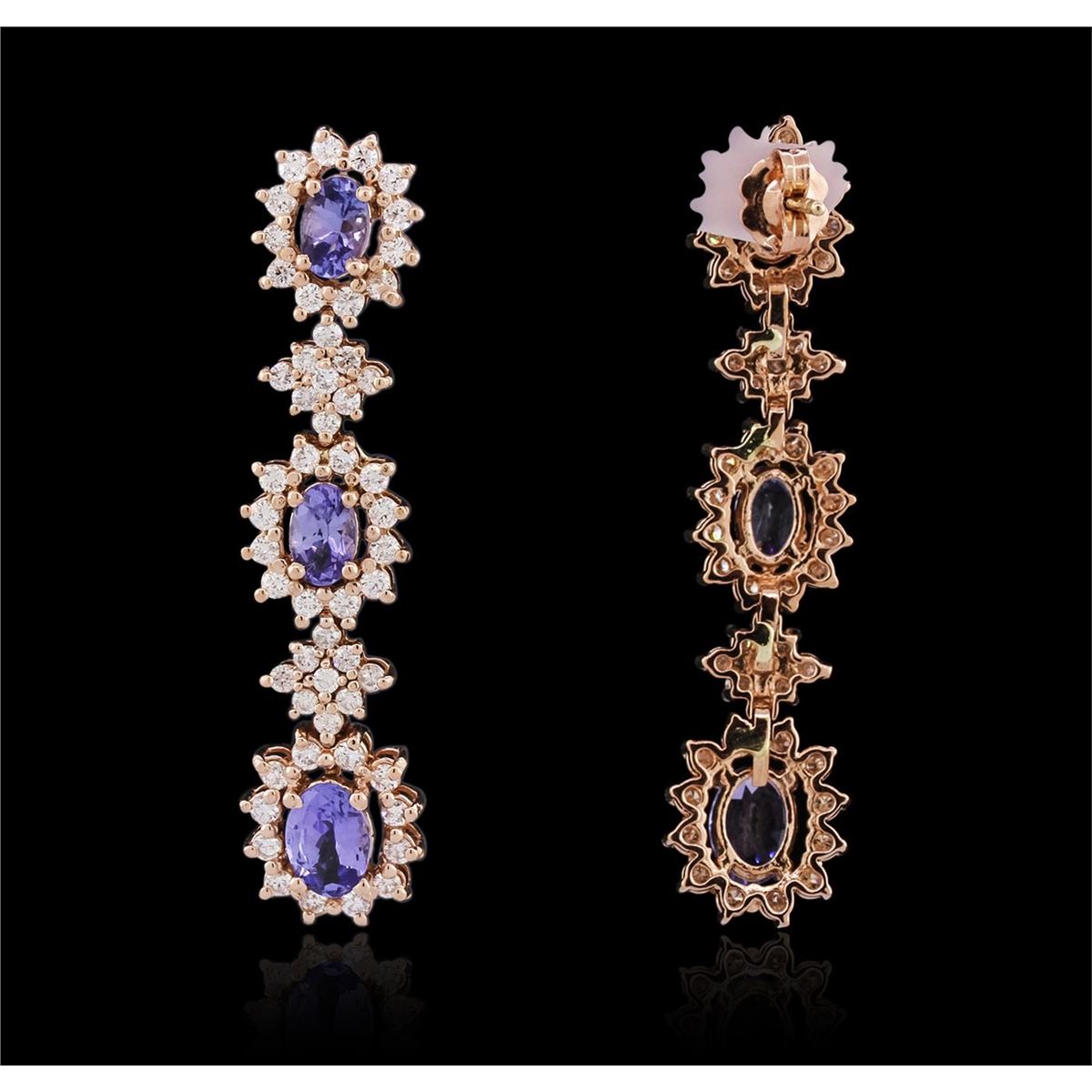 One pair electronically tested 14KT rose gold ladies cast tanzanite and diamond earrings with friction posts with a bright polish finish. Identified with markings of "14K". Condition is new. Containing: Six prong set oval modified brilliant cut natural tanzanites, measuring 7.20 x 5.10 x 3.32mm, approximate total weight of 5.16ct., clarity is eye clean, type I, medium light, very slightly grayish, violet color, (GIA V 4/3), cut is good. One Hundred Eight prong set round brilliant cut diamonds, measuring 1.50 - 1.50 x 0.90mm (depth est.) approximate total weight of 108 Stones = 1.33ct. Clarity: SI-1 to SI-2. Color: J - K, Cut is Good. Colored gemstones are presumed to have been subjected to commonly used enhancement processes. All diamonds and colored gemstones are graded in the mounting, unless otherwise stated. Total Weight of Colored Stones 5.16ct. Total Weight of Diamonds 1.33ct. Total Weight of Earrings 11.20 grams. GGL Appraised at $7,305.00.