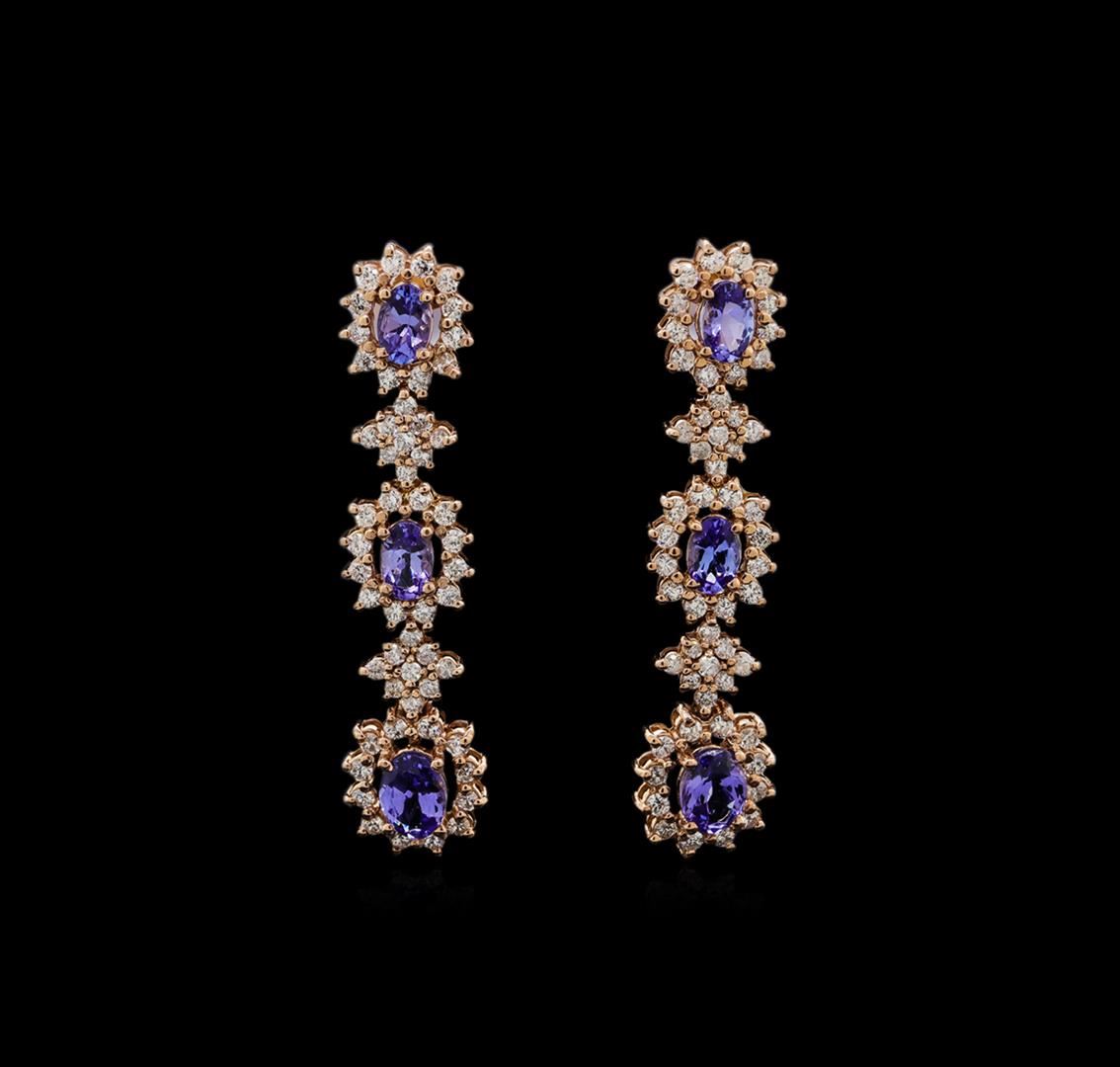 One pair electronically tested 14KT rose gold ladies cast tanzanite and diamond earrings with friction posts with a bright polish finish. Identified with markings of "14K". Condition is new. Containing: Six prong set oval modified brilliant cut natural tanzanites, measuring 7.20 x 5.10 x 3.32mm, approximate total weight of 5.16ct., clarity is eye clean, type I, medium light, very slightly grayish, violet color, (GIA V 4/3), cut is good. One Hundred Eight prong set round brilliant cut diamonds, measuring 1.50 - 1.50 x 0.90mm (depth est.) approximate total weight of 108 Stones = 1.33ct. Clarity: SI-1 to SI-2. Color: J - K, Cut is Good. Colored gemstones are presumed to have been subjected to commonly used enhancement processes. All diamonds and colored gemstones are graded in the mounting, unless otherwise stated. Total Weight of Colored Stones 5.16ct. Total Weight of Diamonds 1.33ct. Total Weight of Earrings 11.20 grams. GGL Appraised.