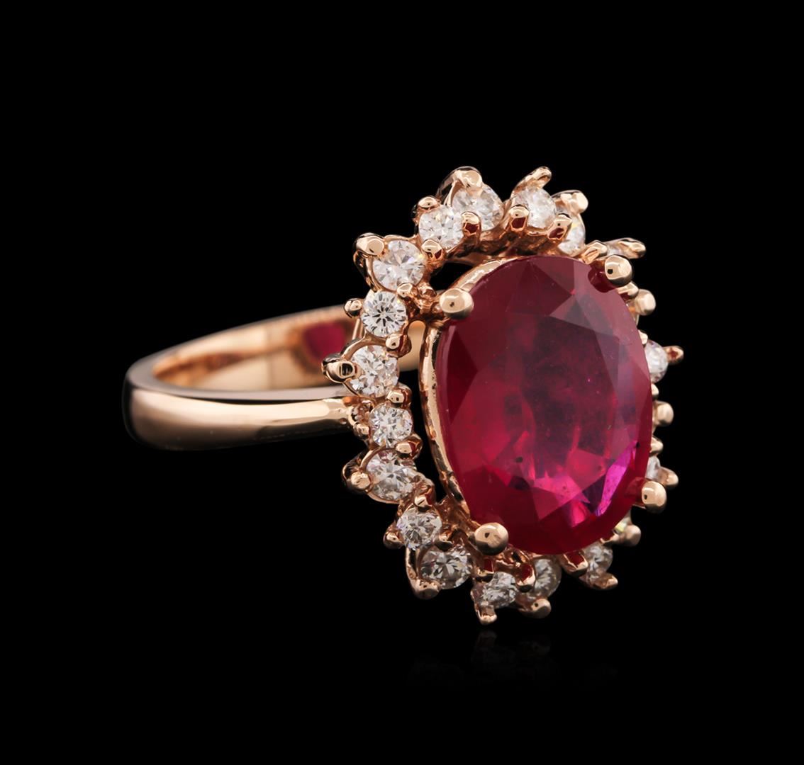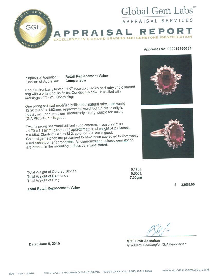 One electronically tested 14KT rose gold ladies cast ruby and diamond ring with a bright polish finish. Identified with markings of "14K". Condition is new. Containing: One prong set oval modified brilliant cut natural ruby, measuring 12.20 x 9.50 x 4.62mm, approximate weight of 5.17ct., clarity is heavily included, medium, moderately strong, purple red color, (GIA PR 5/4), cut is good. Twenty prong set round brilliant cut diamonds, measuring 2.00 - 1.70 x 1.11mm (depth est.) approximate total weight of 20 Stones = 0.65ct. Clarity: SI-1 to SI-2. Color: I - J, Cut is Good. Colored gemstones are presumed to have been subjected to commonly used enhancement processes. All diamonds and colored gemstones are graded in the mounting, unless otherwise stated. Total Weight of Colored Stones 5.17ct. Total Weight of Diamonds 0.65ct. Total Weight of Ring 7.00 grams. GGL Appraised at $3,905.00.