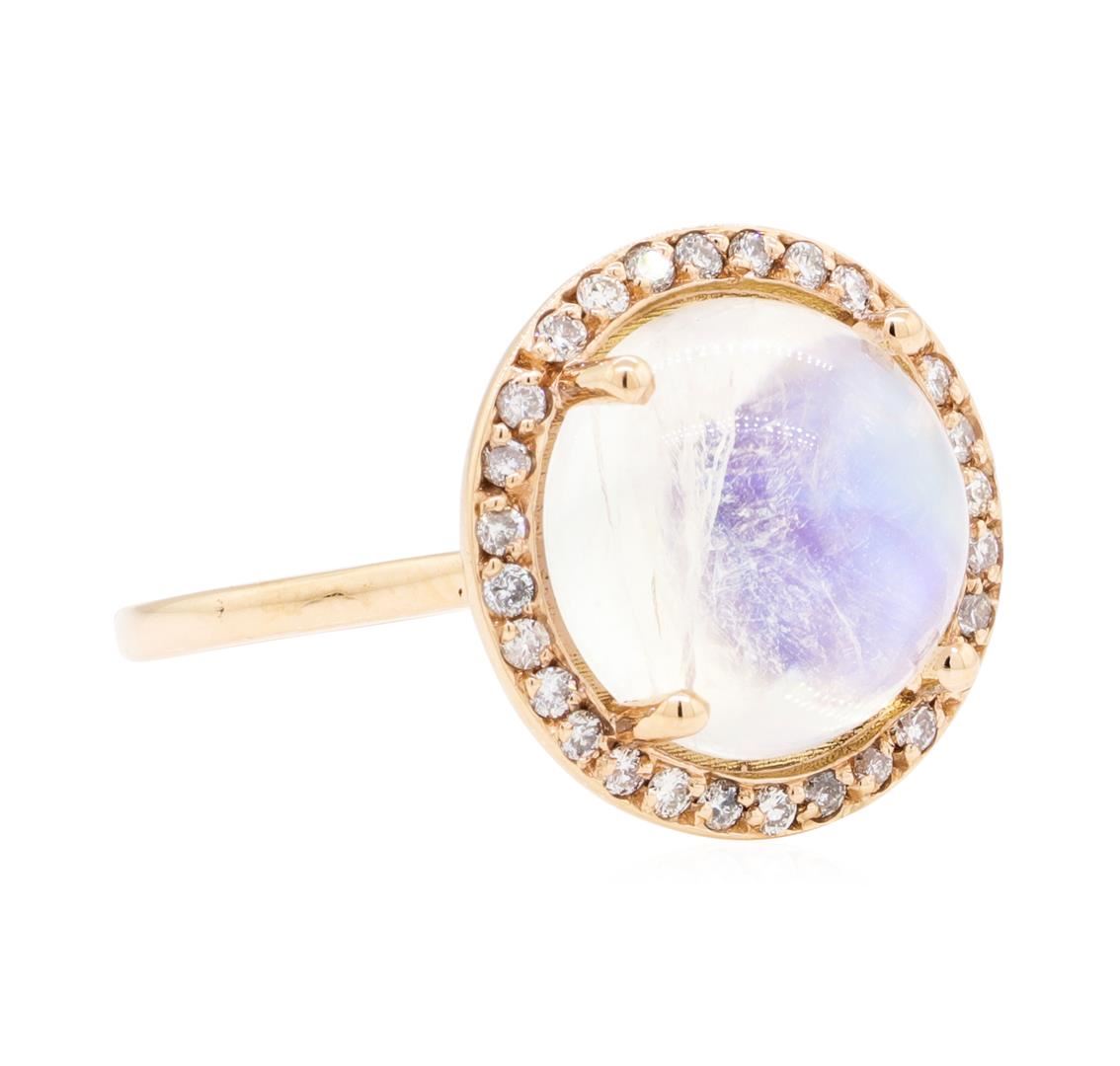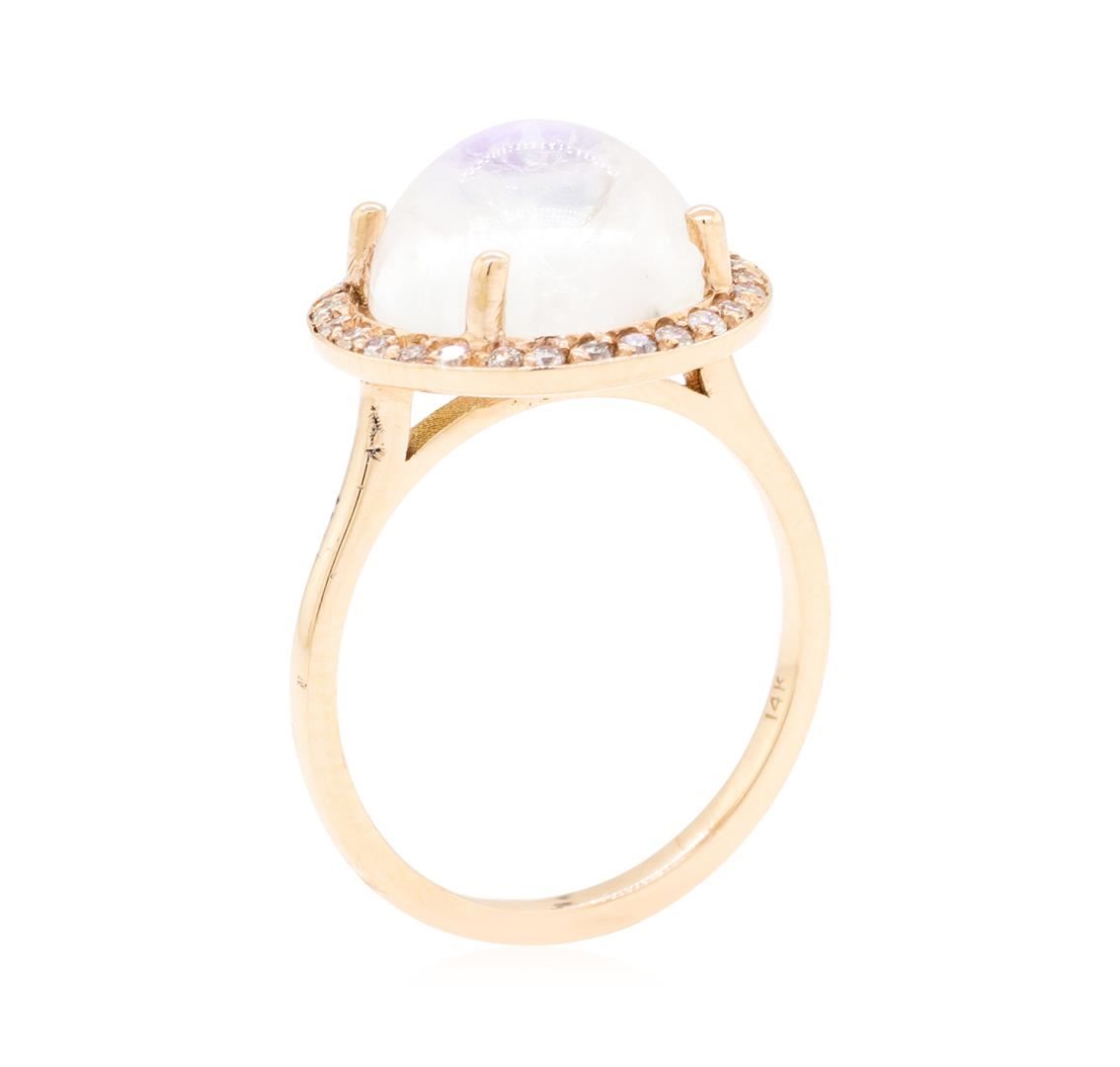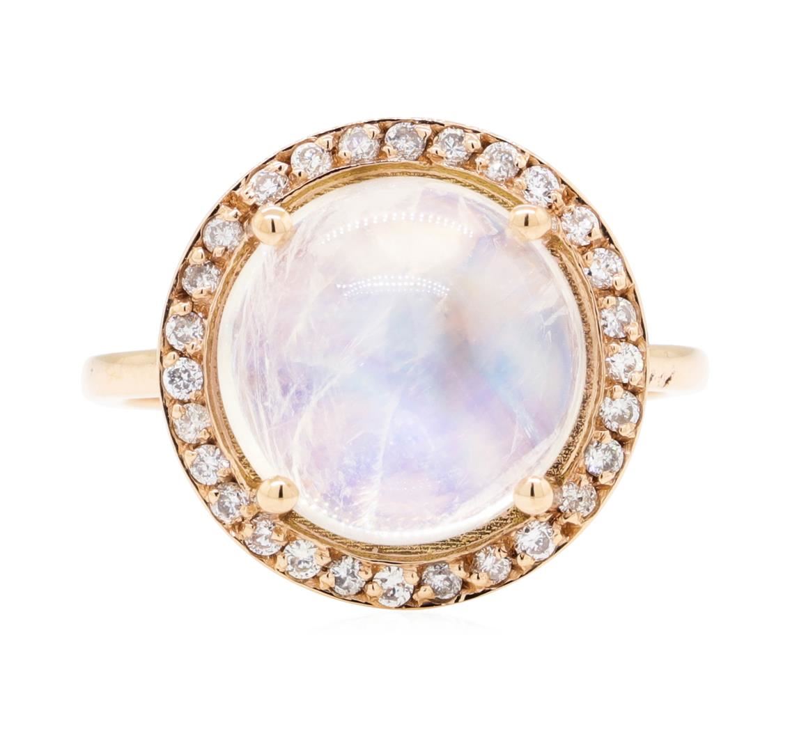 One ring featuring: 14KT rose gold weighing 4.0 grams containing one moonstone weighing 5.24ct diamonds weighing 0.23ctw. The ring is a size 6.5.