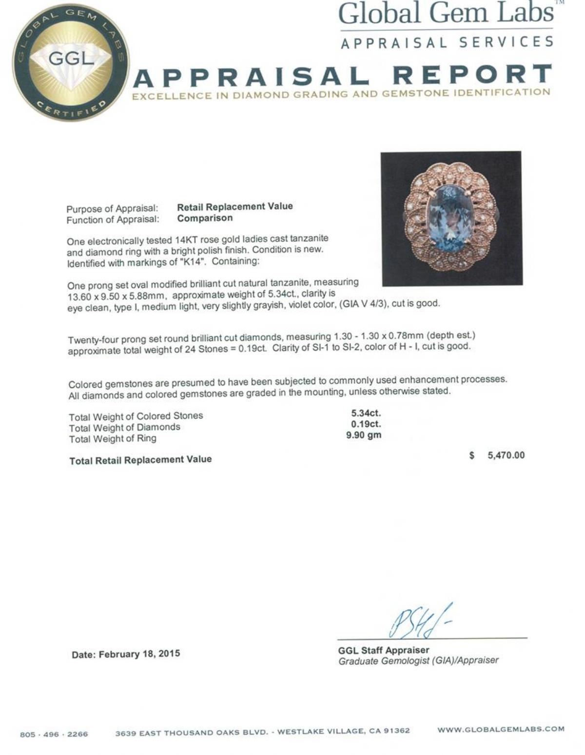 One electronically tested 14KT rose gold ladies cast tanzanite and diamond ring with a bright polish finish. Identified with markings of "K14". Condition is new. Containing: One prong set oval modified brilliant cut natural tanzanite, measuring 13.60 x 9.50 x 5.88mm, approximate weight of 5.34ct., clarity is eye clean, type I, medium light, very slightly grayish, violet color, (GIA V 4/3), cut is good. Twenty-Four prong set round brilliant cut diamonds, measuring 1.30 - 1.30 x 0.78mm (depth est.) approximate total weight of 24 Stones = 0.19ct. Clarity: SI-1 to SI-2. Color: H - I, Cut is Good. Colored gemstones are presumed to have been subjected to commonly used enhancement processes. All diamonds and colored gemstones are graded in the mounting, unless otherwise stated. Total Weight of Colored Stones 5.34ct. Total Weight of Diamonds 0.19ct. Total Weight of Ring 9.90 grams. GGL Appraised.