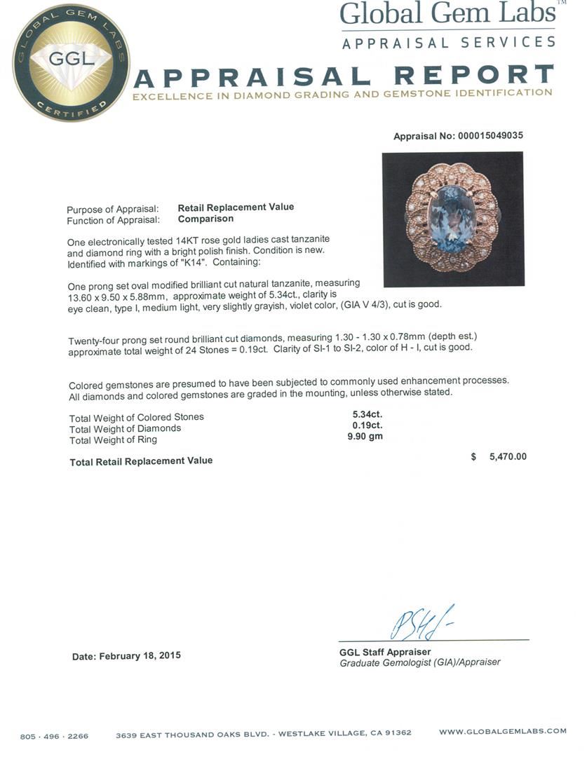 One electronically tested 14KT rose gold ladies cast tanzanite and diamond ring with a bright polish finish. Identified with markings of "K14". Condition is new. Containing: One prong set oval modified brilliant cut natural tanzanite, measuring 13.60 x 9.50 x 5.88mm, approximate weight of 5.34ct., clarity is eye clean, type I, medium light, very slightly grayish, violet color, (GIA V 4/3), cut is good. Twenty-Four prong set round brilliant cut diamonds, measuring 1.30 - 1.30 x 0.78mm (depth est.) approximate total weight of 24 Stones = 0.19ct. Clarity: SI-1 to SI-2. Color: H - I, Cut is Good. Colored gemstones are presumed to have been subjected to commonly used enhancement processes. All diamonds and colored gemstones are graded in the mounting, unless otherwise stated. Total Weight of Colored Stones 5.34ct. Total Weight of Diamonds 0.19ct. Total Weight of Ring 9.90 grams. GGL Appraised at $5,470.00.