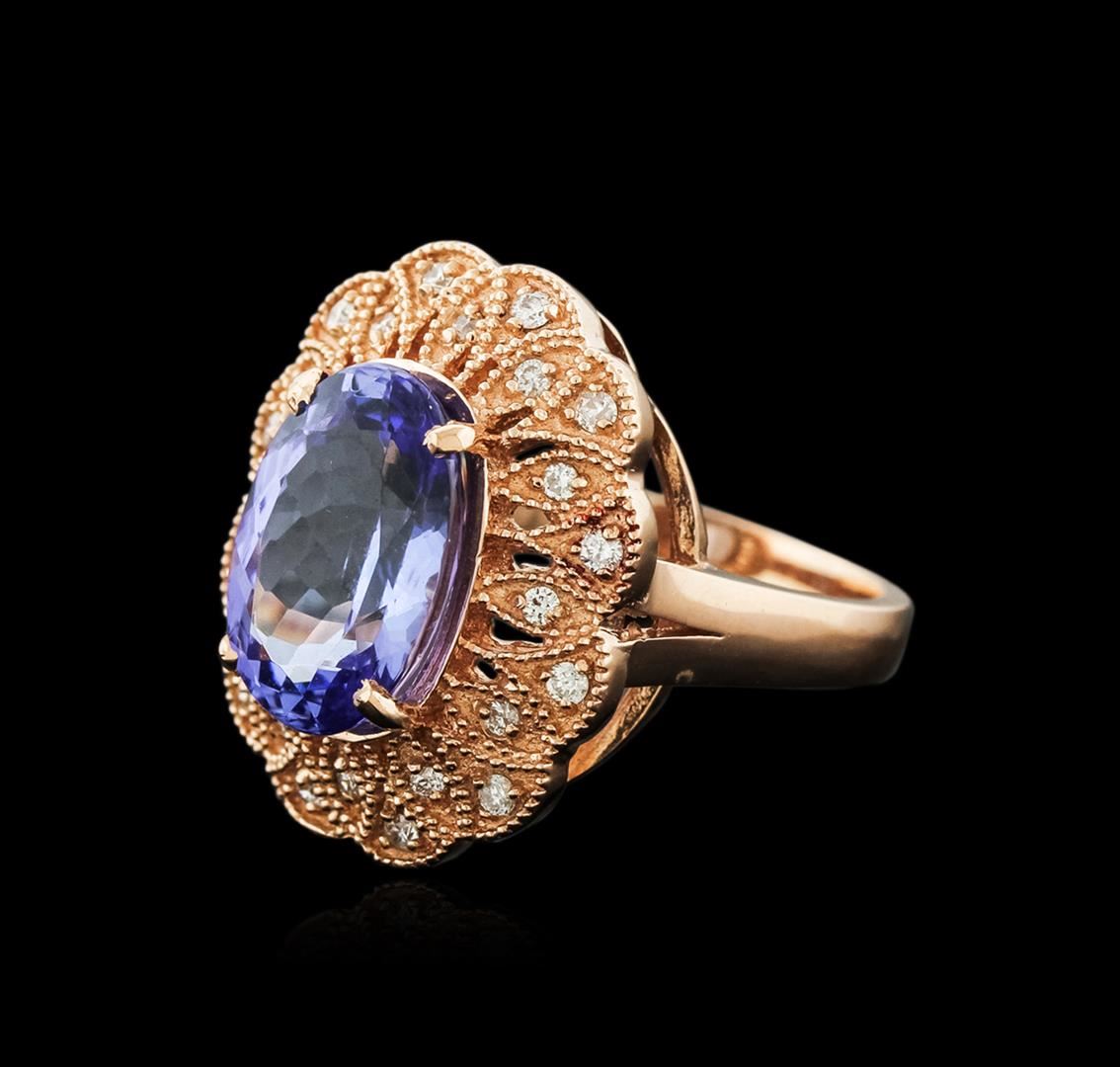 One electronically tested 14KT rose gold ladies cast tanzanite and diamond ring with a bright polish finish. Identified with markings of "K14". Condition is new. Containing: One prong set oval modified brilliant cut natural tanzanite, measuring 13.60 x 9.50 x 5.88mm, approximate weight of 5.34ct., clarity is eye clean, type I, medium light, very slightly grayish, violet color, (GIA V 4/3), cut is good. Twenty-Four prong set round brilliant cut diamonds, measuring 1.30 - 1.30 x 0.78mm (depth est.) approximate total weight of 24 Stones = 0.19ct. Clarity: SI-1 to SI-2. Color: H - I, Cut is Good. Colored gemstones are presumed to have been subjected to commonly used enhancement processes. All diamonds and colored gemstones are graded in the mounting, unless otherwise stated. Total Weight of Colored Stones 5.34ct. Total Weight of Diamonds 0.19ct. Total Weight of Ring 9.90 grams. GGL Appraised at $5,470.00.