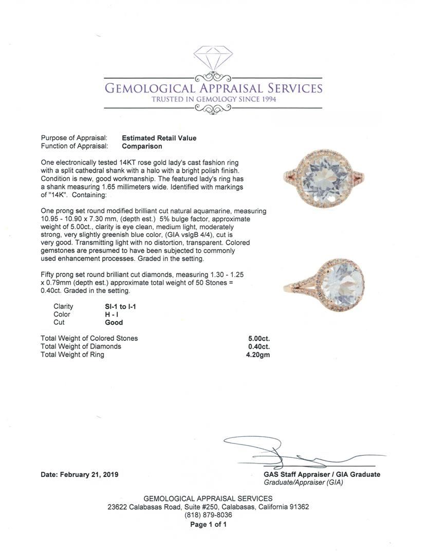 One electronically tested 14KT rose gold lady's cast fashion ring with a split cathedral shank with a halo with a bright polish finish. The featured lady's ring has a shank measuring 1.65 millimeters wide. Identified with markings of '14K'. Condition is new, good workmanship. Containing: One prong set round modified brilliant cut natural aquamarine, measuring 10.95 - 10.90 x 7.30 mm, (depth est.) 5%. bulge factor, approximate weight of 5.00ct.,, Clarity is eye clean, medium light, moderately strong, very slightly greenish blue color, (GIA vslgB 4/4), cut is very good. Transmitting light with no distortion, transparent. Colored gemstones are presumed to have been subjected to commonly used enhancement processes. Graded in the setting. Fifty prong set round brilliant cut diamonds, measuring 1.30 - 1.25 x 0.79mm (depth est.) approximate total weight of 50 Stones = 0.40ct. Graded in the setting. Color H - I, Clarity SI-1 to I-1, Cut Good. Total Weight of Colored Stones 5.00ct. Total Weight of Diamonds 0.40ct. Total Weight of Ring 4.20gm. GAS Appraised.