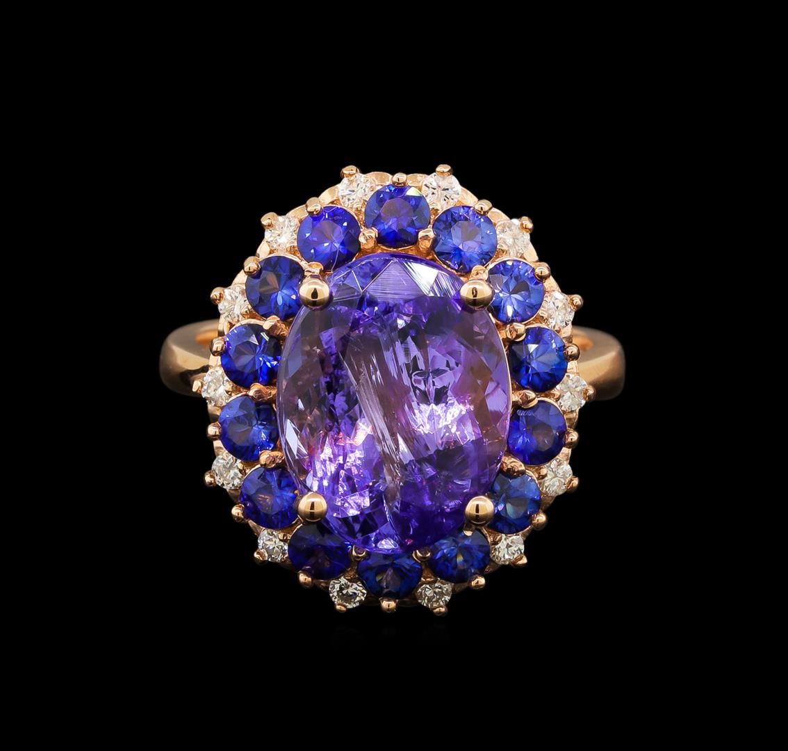 One electronically tested 14KT rose gold ladies cast tanzinite, sapphire and diamond ring with a bright polish finish. Identified with markings of "14K". Condition is new. Containing: One prong set oval modified brilliant cut natural tanzanite, measuring 13.00 x 10.00 x 6.50mm, approximate weight of 5.94ct., clarity is eye clean, type I, medium, very slightly grayish, violet color, (GIA V 5/3), cut is good. Fourteen prong set round modified brilliant cut natural blue sapphires, measuring 3.00 - 3.00 x 1.95 mm, approximate total weight of 1.96ct., clarity is slightly included, type II, medium, moderately strong, blue color, (GIA B 5/4), cut is good. Fourteen prong set round brilliant cut diamonds, measuring 1.50 - 1.50 x 0.90mm (depth est.) approximate total weight of 14 Stones = 0.17ct. Clarity: SI-1 to SI-2. Color: J - K, Cut is Good. Colored gemstones are presumed to have been subjected to commonly used enhancement processes. All diamonds and colored gemstones are graded in the mounting, unless otherwise stated. Total Weight of Colored Stones 7.90ct. Total Weight of Diamonds 0.17ct. Total Weight of Ring 8.00 grams. GGL Appraised at $5,155.00.