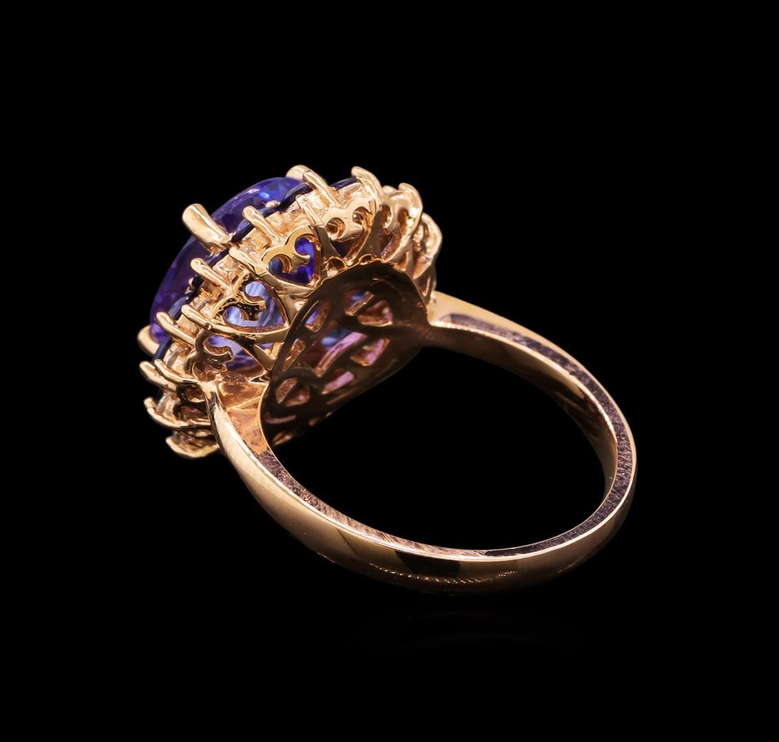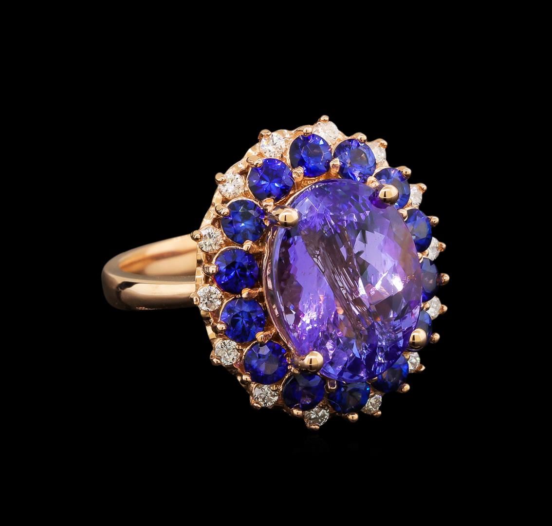 One electronically tested 14KT rose gold ladies cast tanzinite, sapphire and diamond ring with a bright polish finish. Identified with markings of "14K". Condition is new. Containing: One prong set oval modified brilliant cut natural tanzanite, measuring 13.00 x 10.00 x 6.50mm, approximate weight of 5.94ct., clarity is eye clean, type I, medium, very slightly grayish, violet color, (GIA V 5/3), cut is good. Fourteen prong set round modified brilliant cut natural blue sapphires, measuring 3.00 - 3.00 x 1.95 mm, approximate total weight of 1.96ct., clarity is slightly included, type II, medium, moderately strong, blue color, (GIA B 5/4), cut is good. Fourteen prong set round brilliant cut diamonds, measuring 1.50 - 1.50 x 0.90mm (depth est.) approximate total weight of 14 Stones = 0.17ct. Clarity: SI-1 to SI-2. Color: J - K, Cut is Good. Colored gemstones are presumed to have been subjected to commonly used enhancement processes. All diamonds and colored gemstones are graded in the mounting, unless otherwise stated. Total Weight of Colored Stones 7.90ct. Total Weight of Diamonds 0.17ct. Total Weight of Ring 8.00 grams. GGL Appraised at $5,155.00.