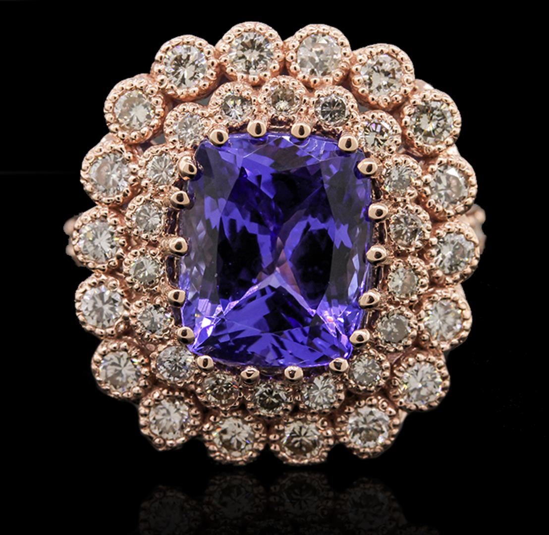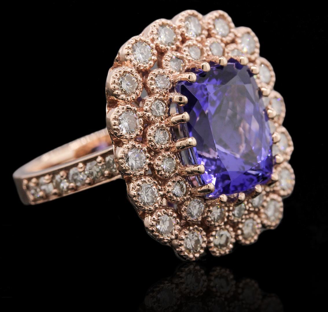 One electronically tested 14KT rose gold Ladies combination cast & assembled ring with a bright polish finish. Condition is new. Identified with markings of "K14". Containing: One prong set rectangular cushion modified brilliant cut natural tanzanite, measuring 11.20 x 9.92 x 6.80mm, approximate weight of 5.95ct., clarity is eye clean, type I, medium, moderately strong, bluish violet color, (GIA bV 5/4), cut is very good. Colored gemstones are presumed to have been subjected to commonly used color/clarity enhancement processes. Thirty-One prong set round brilliant cut diamonds, measuring 1.60 - 1.60 x 0.96mm (depth est.) approximate. Total Weight of 31 Stones = 0.46ct. Clarity: I-1 to I-2. Color: L - M, Cut is Good. Nineteen prong set round brilliant cut diamonds, measuring 2.50 - 2.50 x 1.50mm (depth est.) approximate. Total Weight of 19 Stones = 1.09ct. Clarity: SI-1 to SI-2. Color: M - N, Cut is Good. Total Weight of Colored Stones 5.95ct. Total Weight of Diamonds 1.55ct. Total Weight of Ring 8.90 grams. GGL Appraised at $13,395.00.
