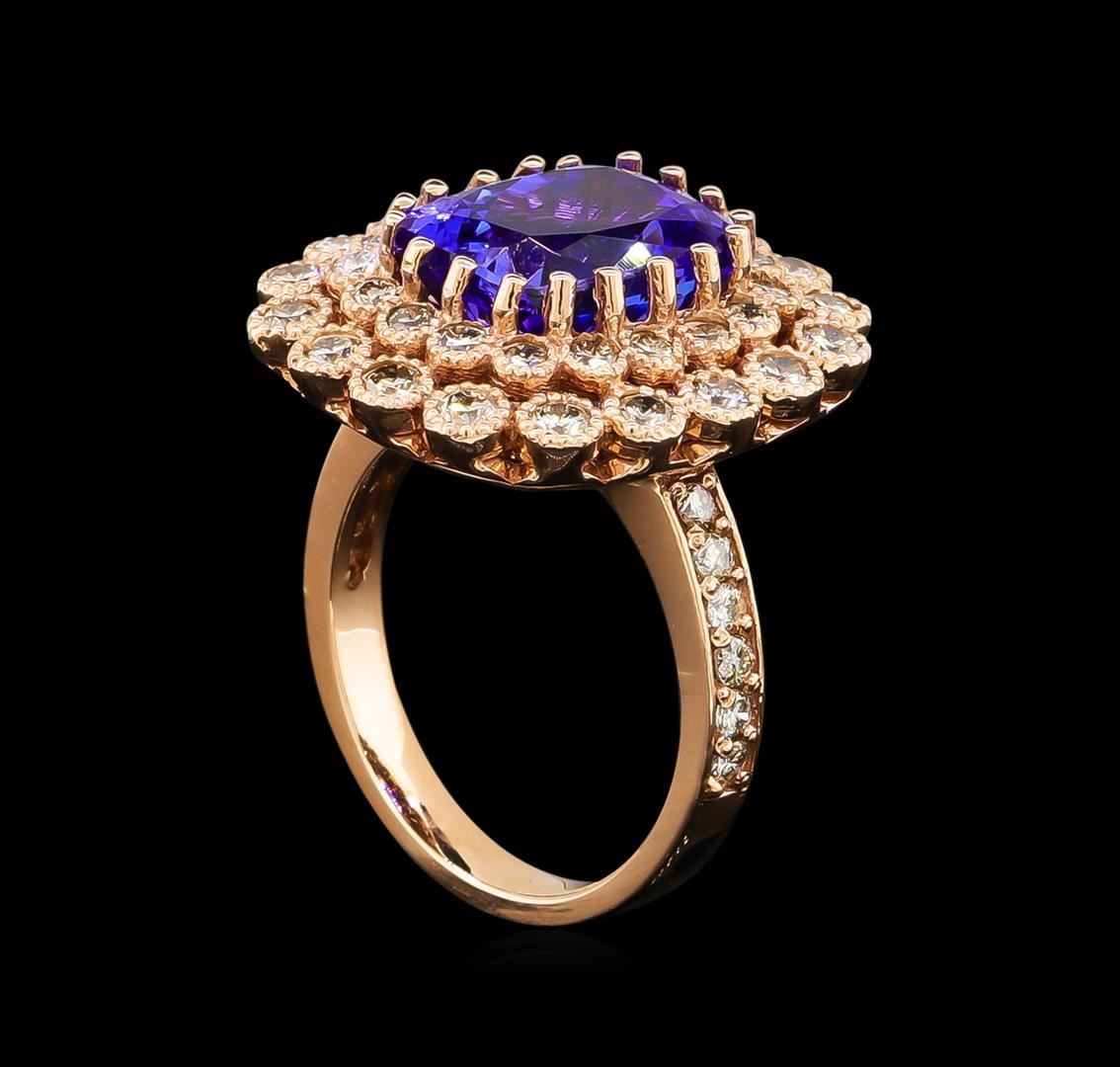 One electronically tested 14KT rose gold Ladies combination cast & assembled ring with a bright polish finish. Condition is new. Identified with markings of "K14". Containing: One prong set rectangular cushion modified brilliant cut natural tanzanite, measuring 11.20 x 9.92 x 6.80mm, approximate weight of 5.95ct., clarity is eye clean, type I, medium, moderately strong, bluish violet color, (GIA bV 5/4), cut is very good. Colored gemstones are presumed to have been subjected to commonly used color/clarity enhancement processes. Thirty-One prong set round brilliant cut diamonds, measuring 1.60 - 1.60 x 0.96mm (depth est.) approximate. Total Weight of 31 Stones = 0.46ct. Clarity: I-1 to I-2. Color: L - M, Cut is Good. Nineteen prong set round brilliant cut diamonds, measuring 2.50 - 2.50 x 1.50mm (depth est.) approximate. Total Weight of 19 Stones = 1.09ct. Clarity: SI-1 to SI-2. Color: M - N, Cut is Good. Total Weight of Colored Stones 5.95ct. Total Weight of Diamonds 1.55ct. Total Weight of Ring 8.90 grams. GGL Appraised.