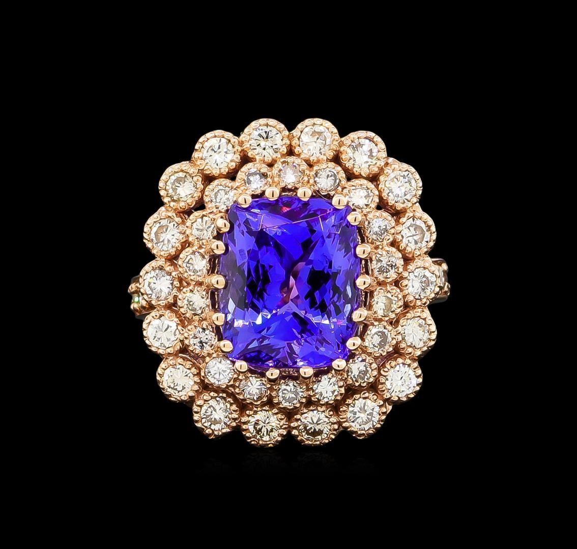 One electronically tested 14KT rose gold Ladies combination cast & assembled ring with a bright polish finish. Condition is new. Identified with markings of "K14". Containing: One prong set rectangular cushion modified brilliant cut natural tanzanite, measuring 11.20 x 9.92 x 6.80mm, approximate weight of 5.95ct., clarity is eye clean, type I, medium, moderately strong, bluish violet color, (GIA bV 5/4), cut is very good. Colored gemstones are presumed to have been subjected to commonly used color/clarity enhancement processes. Thirty-One prong set round brilliant cut diamonds, measuring 1.60 - 1.60 x 0.96mm (depth est.) approximate. Total Weight of 31 Stones = 0.46ct. Clarity: I-1 to I-2. Color: L - M, Cut is Good. Nineteen prong set round brilliant cut diamonds, measuring 2.50 - 2.50 x 1.50mm (depth est.) approximate. Total Weight of 19 Stones = 1.09ct. Clarity: SI-1 to SI-2. Color: M - N, Cut is Good. Total Weight of Colored Stones 5.95ct. Total Weight of Diamonds 1.55ct. Total Weight of Ring 8.90 grams. GGL Appraised.