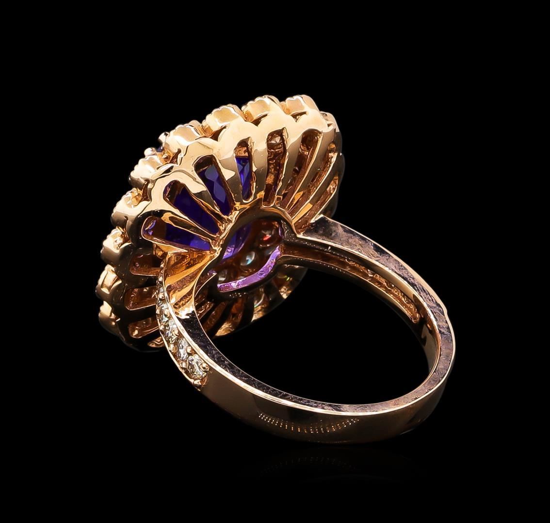 One electronically tested 14KT rose gold Ladies combination cast & assembled ring with a bright polish finish. Condition is new. Identified with markings of "K14". Containing: One prong set rectangular cushion modified brilliant cut natural tanzanite, measuring 11.20 x 9.92 x 6.80mm, approximate weight of 5.95ct., clarity is eye clean, type I, medium, moderately strong, bluish violet color, (GIA bV 5/4), cut is very good. Colored gemstones are presumed to have been subjected to commonly used color/clarity enhancement processes. Thirty-One prong set round brilliant cut diamonds, measuring 1.60 - 1.60 x 0.96mm (depth est.) approximate. Total Weight of 31 Stones = 0.46ct. Clarity: I-1 to I-2. Color: L - M, Cut is Good. Nineteen prong set round brilliant cut diamonds, measuring 2.50 - 2.50 x 1.50mm (depth est.) approximate. Total Weight of 19 Stones = 1.09ct. Clarity: SI-1 to SI-2. Color: M - N, Cut is Good. Total Weight of Colored Stones 5.95ct. Total Weight of Diamonds 1.55ct. Total Weight of Ring 8.90 grams. GGL Appraised.