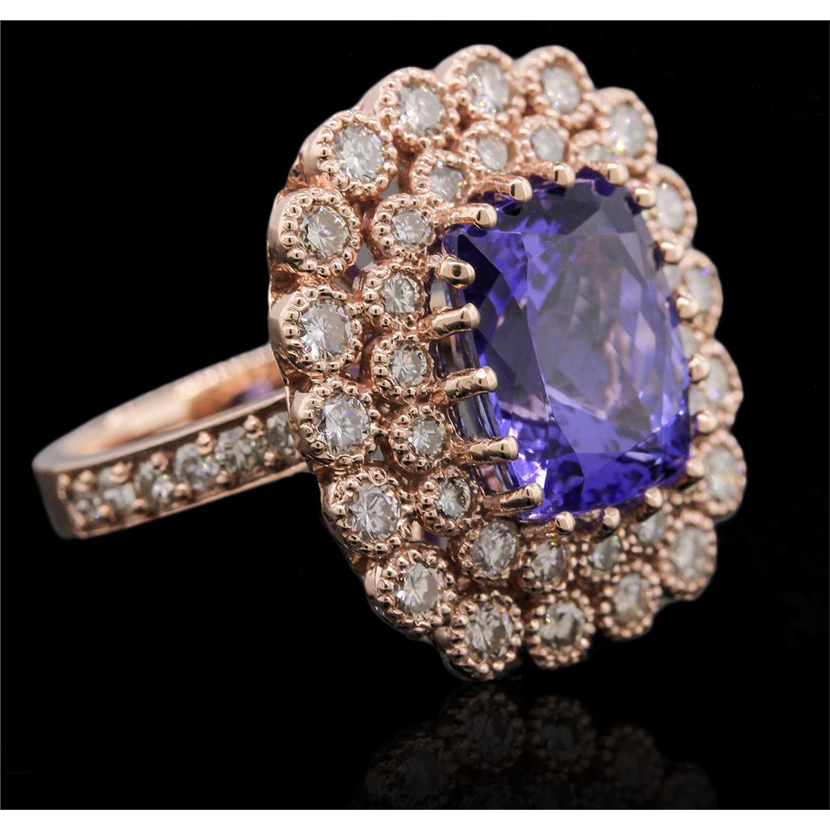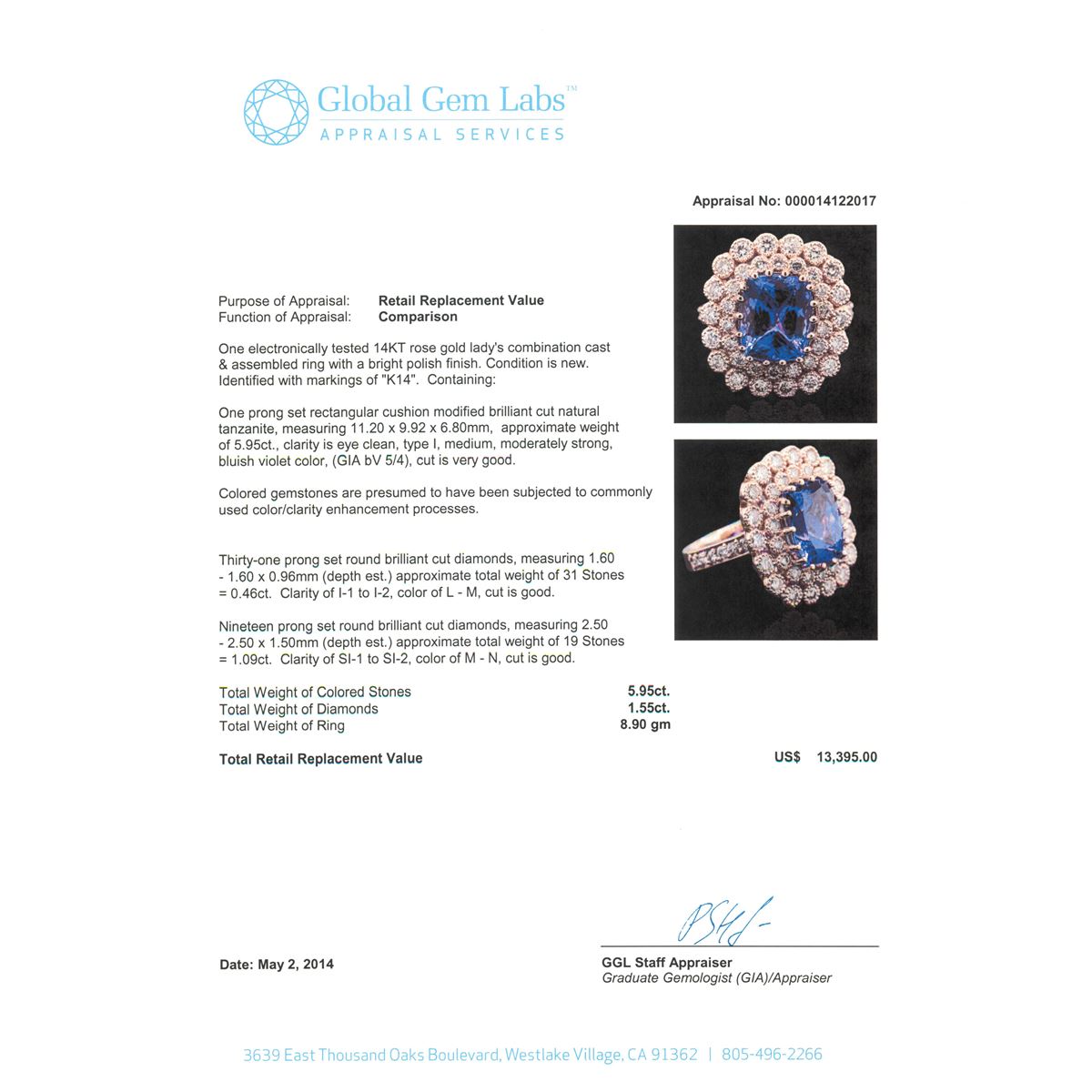 One electronically tested 14KT rose gold Ladies combination cast & assembled ring with a bright polish finish. Condition is new. Identified with markings of "K14". Containing: One prong set rectangular cushion modified brilliant cut natural tanzanite, measuring 11.20 x 9.92 x 6.80mm, approximate weight of 5.95ct., clarity is eye clean, type I, medium, moderately strong, bluish violet color, (GIA bV 5/4), cut is very good. Colored gemstones are presumed to have been subjected to commonly used color/clarity enhancement processes. Thirty-One prong set round brilliant cut diamonds, measuring 1.60 - 1.60 x 0.96mm (depth est.) approximate. Total Weight of 31 Stones = 0.46ct. Clarity: I-1 to I-2. Color: L - M, Cut is Good. Nineteen prong set round brilliant cut diamonds, measuring 2.50 - 2.50 x 1.50mm (depth est.) approximate. Total Weight of 19 Stones = 1.09ct. Clarity: SI-1 to SI-2. Color: M - N, Cut is Good. Total Weight of Colored Stones 5.95ct. Total Weight of Diamonds 1.55ct. Total Weight of Ring 8.90 grams. GGL Appraised at $13,395.00.