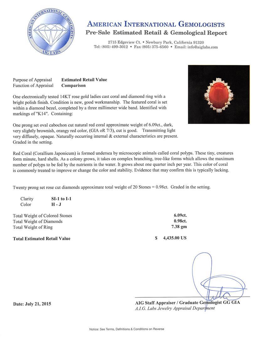 One electronically tested 14KT rose gold ladies cast coral and diamond ring with a bright polish finish. Condition is new, good workmanship. The featured coral is set within a diamond bezel, completed by a three millimeter wide band. Identified with markings of "K14". Containing: One prong set oval cabochon cut coral approximate weight of 6.09ct., dark, very slightly brownish, orangy red color (GIA oR 7/3), cut is good. Transmitting light very diffusely, opaque. Naturally occurring internal and external characteristics are present. Graded in the setting. Twenty prong set round brilliant cut diamonds approximate total weight of 20 Stones = 0.98ctw. Graded in the setting. Clarity SI-1 to I-1, Color H - J. Total weight of Colored Stones 6.09ct., Total Weight of Diamonds 0.98ct., Total Weight of Ring 7.38gm. AIG Appraised at $4,435.00.