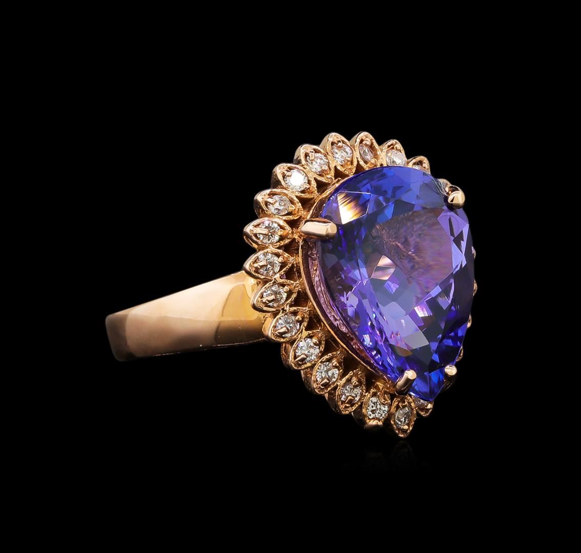 One electronically tested 14KT rose gold ladies cast tanzanite and diamond ring with a bright polish finish. Identified with markings of "K14". Condition is new. Containing: One prong set pear modified brilliant cut natural tanzanite, measuring 14.00 x 10.00 x 6.51mm, approximate weight of 6.11ct., clarity is eye clean, type I, medium light, very slightly grayish, violet color, (GIA V 4/3), cut is good. Twenty-Five prong set round brilliant cut diamonds, measuring 1.30 - 1.30 x 0.78mm (depth est.) approximate. total weight of 25 Stones = 0.20ct. Clarity: SI-2 to I-1. Color: J - K, Cut is Good. Colored gemstones are presumed to have been subjected to commonly used enhancement processes. All diamonds and colored gemstones are graded in the mounting, unless otherwise stated. Total Weight of Colored Stones 6.11ct. Total Weight of Diamonds 0.20ct. Total Weight of Ring 7.30 grams. GGL Appraised at $4,495.00.